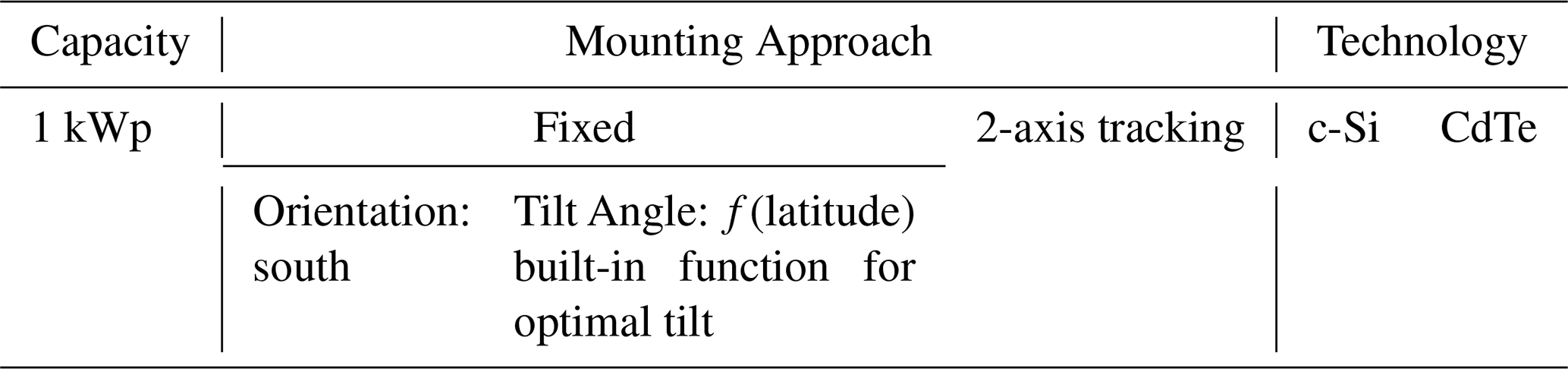 For the purposes of this study, we simulated solar plants with capacity of 1 kWp, and for both available technologies. The simulations with c-Si technology, considered as default by the model, are presented in detail the following sections. The results of the simulations with CdTe technology are provided in the supplement, and are not thoroughly discussed, since they are very similar to the results for the c-Si technology. Regarding the mounting approach, the solar plants were either static and oriented to the south or equipped with a 2-axis solar tracking system. In the case of fixed panels, we selected the optimal tilt angle relying on the latitude dependent built-in function.