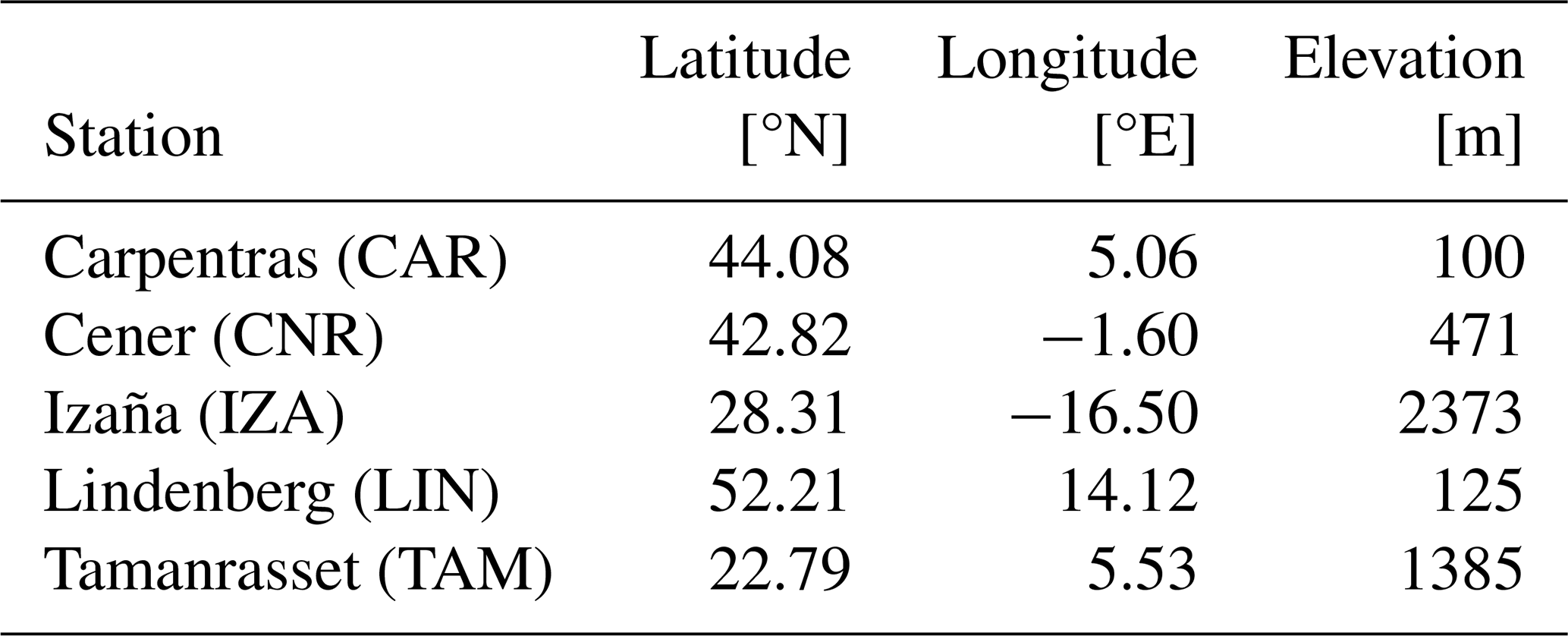 The selected locations have quite different atmospheric conditions regarding cloudiness and aerosols. Additionally, they vary in altitude. A brief overview of the prevailing conditions derived from the ground-based data is provided on the supplement. Regarding cloudiness, it is notable that in Lindenberg the sky is generally overcast, whereas in southern locations sunshine dominates. In terms of aerosols, very high aerosol loads occur more frequently in Tamanrasset. As for aerosol type, there is considerable variation among the examined locations: Carpentras, Cener, and Lindenberg are primarily influenced by fine mode aerosols, while Tamanrasset and Izaña are mostly affected by coarse mode aerosols.