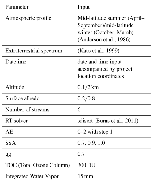 The standard aerosol profiles (Anderson et al., 1986) were used for all sites. According to Fountoulakis et al. (2022), using a more accurate vertical distribution of aerosols in the troposphere would have a negligible effect in the GHI and DHI at the Earth's surface. Table 3 illustrates the libRadtran settings used in this study.