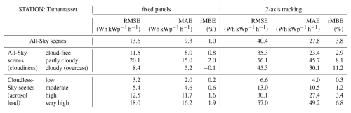 Additionally, Tables 4 and 5 present the validation results for Carpentras and Tamanrasset, selected as representative locations that encompass a wide variety of sky conditions. Validation results for the remaining stations are available in the supplement (Tables S1–S3). All the evaluation metrics correspond to simulations of PV panels with c-Si technology.