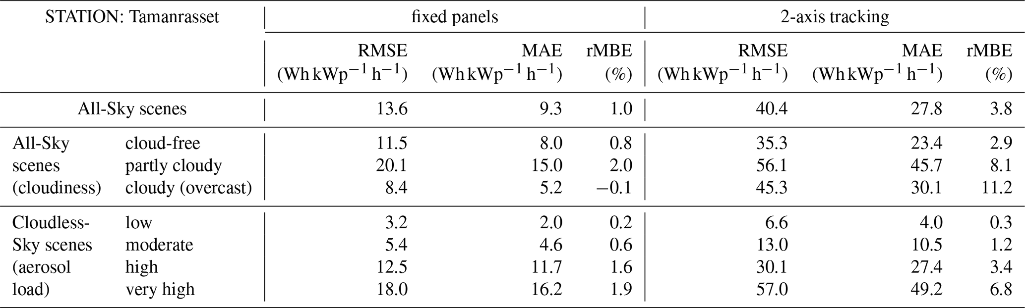 Based on the calculated statistical indices, the Root Mean Square Error (RMSE) values for fixed panels range from 4.7 Wh kWp−1 h−1 (clear sky) to 19.5 Wh kWp−1 h−1 (partly cloudy) in Carpentras, and from 3.2 to 20.1 Wh kWp−1 h−1 in Tamanrasset. Under very high aerosol loading, RMSE reaches 14.9 and 18.0 Wh kWp−1 h−1, respectively. For 2-axis tracking systems, RMSE values vary significantly, ranging from 9.5 to 32.5 Wh kWp−1 h−1 in Carpentras and from 6.6 to 56.1 Wh kWp−1 h−1 in Tamanrasset, with peaks of 22.7 and 57.0 Wh kWp−1 h−1 under very high aerosol loading conditions. Similarly, the Mean Absolut Error (MAE) values are generally lower for fixed panels (3.4–12.5 Wh kWp−1 h−1 in Carpentras, 2.0–15.0 in Tamanrasset) and substantially higher for 2-axis tracking (7.5–23.9 and 4.0–45.7 Wh kWp−1 h−1, respectively). Notably in Tamanrasset, MAE values under very high aerosol loading exceed those observed under partly cloudy conditions, with values increasing from 15.0 to 16.2 Wh kWp−1 h−1 for fixed panels and from 45.7 to 49.2 Wh kWp−1 h−1 for 2-axis tracking systems. Regarding the relative mean bias (rMBE), this remains mostly within ±4.6 % for fixed panels but can reach up to 11.2 % for 2-axis tracking, particularly in aerosol-laden conditions.
