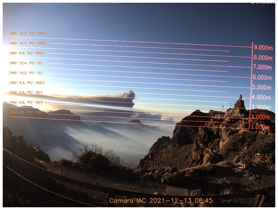 To perform direct measurements on the images, a calibrated scale needed to be established (see Fig. 1). The calibration process involved multiple simultaneous measurements of the same reference points using both image analysis and geodetic methods. A trigonometrical station, located approximately 30 m from the camera, was used for this purpose. The resulting scale was used to generate a grid that was automatically superimposed on the images, enabling real-time measurements of the volcanic plume height on demand. This grid also included wind direction and speed at different altitudes, as presented in Fig. 1, which was crucial for accurate estimation of the column height.