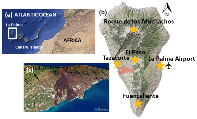 Figure 2(a) Location of La Palma and the Canary Islands in the Atlantic Ocean, (b) location of the five AEMET-ACTRIS stations (orange stars) deployed in La Palma and (c) 3D visualisation generated using the image acquired by one of the Copernicus Sentinel-2 satellites on 3 January 2022. The red spot in (b) marks the location of the volcanic vents. Credits on the map: ©Google Earth 2023, GRAFCAN 2023 and European Union, Copernicus Sentinel-2 imagery 2022.