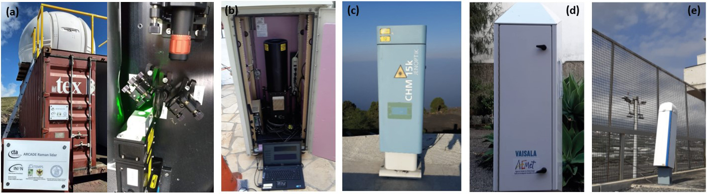 Figure 3View of the different instruments belonging to the AEMET-ACTRIS profiling network: (a) ARCADE Raman lidar at Roque de los Muchachos, (b) MPL-4B at Tazacorte, (c) CHM15k at Fuencaliente, (d) CL61 at El Paso and (e) CL51 at La Palma Airport.