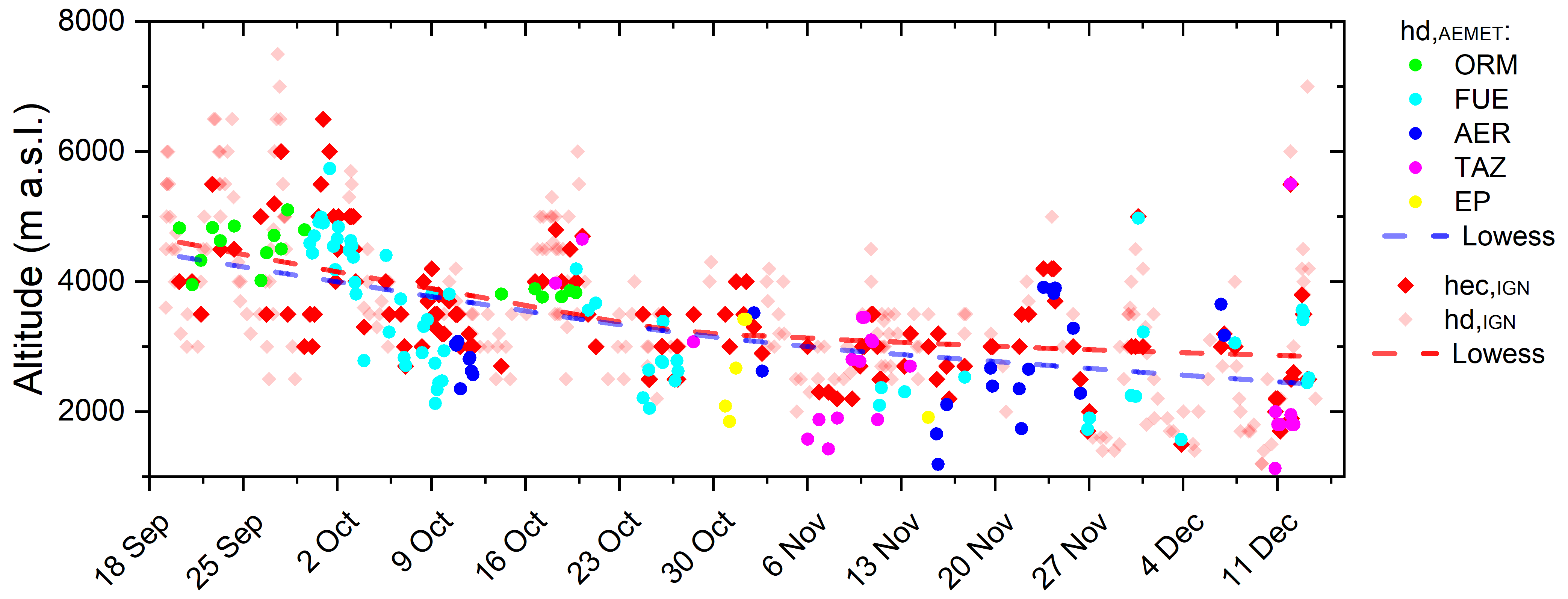 The eruptive column height measured by the IGN (hec,IGN) is shown in Fig. 4, along with the dispersive plume height (hd) obtained from both the IGN and AEMET-ACTRIS networks (hd,IGN and hd,AEMET, respectively). hec,IGN and hd,IGN correspond to 344 measurements made by the IGN at times when a significant change in column height was observed. hd,AEMET (137 altitudes) were retrieved concurrently with the IGN observations using the methodology described in Sect. 3.3 for each of the five profiling stations in the network (integrated over a ±5 min interval around the IGN observation time).
