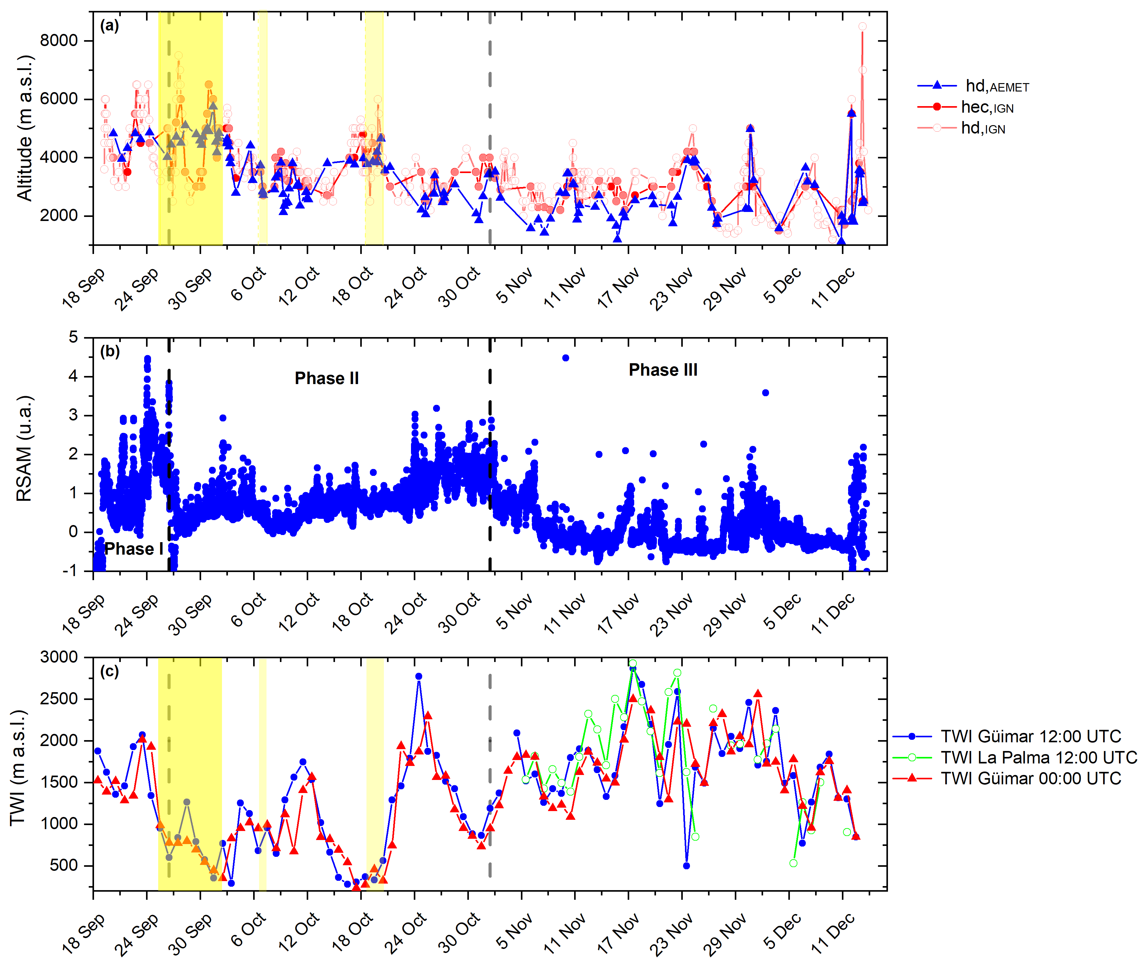 In this study, the eruptive process was characterised in terms of the altitude of the dispersive volcanic plume (hd), measured by both IGN and AEMET-ACTRIS, and the altitude of the eruptive column (hec), measured by IGN. Modulating factors such as seismicity and meteorological conditions were also analysed. The consistency between the two independent and complementary datasets (hd,IGN and hd,AEMET) was assessed throughout the eruption (mean difference of 258.6 m).