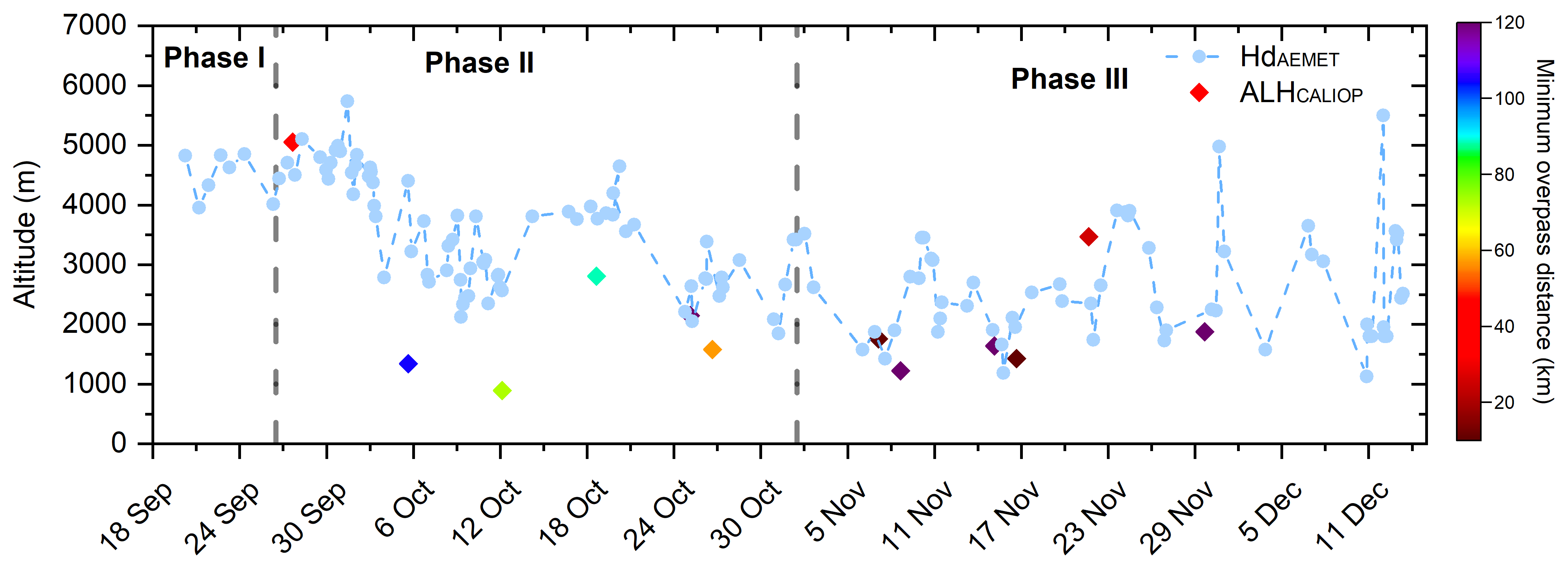 hd,AEMET was qualitatively estimated with this instrument from 19 September to 27 October at two fixed times per day (06:00 and 19:00 UTC), resulting in a total of 18 hd,AEMET values retrieved from this site. The estimation was based on visual inspection of the aerosol backscatter profiles, when available. Although the approach used at RMO is qualitative, the plume altitude measurements provided by this instrument have been included in this study, as they represent the only available information on the volcanic plume during the initial phase of the eruption and were the sole profiler data from the northern part of La Palma until the CL61 at El Paso station became operational on 25 October. This information proved to be extremely valuable during the eruptive process, with some of the ARCADE-derived altitudes reportedly used by PEVOLCA. From 27 October 2021 onwards, a technical issue prevented the ARCADE team from continuing plume monitoring, and the instrument's operation was definitively discontinued.