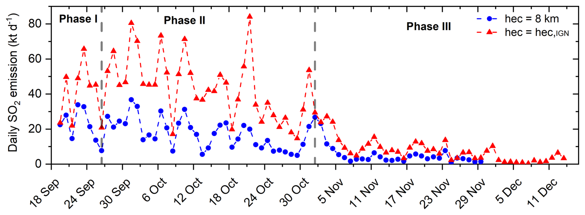 Finally, the impact of using hec in estimating SO2 emissions from the NASA MSVOLSO2L4 satellite-based product was evaluated. When a fixed (standard) plume altitude of 8 km was used instead of the observed hec, the total SO2 emission was significantly underestimated by an average of 56.2 %, and by up to 84.7 %. These findings underscore the importance of accurately determining the volcanic plume height when deriving SO2 emissions from satellite data.