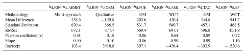 By combining information from these five sites, a single hd,AEMET time series was constructed, given that the proximity of the stations to the volcano and to each other ensures that no significant dispersive processes occur either horizontally or vertically, nor are intra-plume chemical reactions expected. This assumption is supported by previous findings on intra-plume interactions (e.g., Taquet et al.2025). A total of 137 altitudes of the dispersive column (hd,AEMET) have been included in the comparison analysis, coincident with those values measured by IGN. hd,AEMET observations from these five profilers have been selected for the comparison with IGN's database as those lying in a time interval of ±5 min around IGN observation time. In cases where multiple AEMET heights from different profilers and sites coincide with the IGN height, the one most influenced by the volcanic plume, based on the prevailing wind direction, is selected. Taking into account the inherent problems in retrieving hd,AEMET from this on-site profiler network (signal blocking by the dense volcanic plume, high signal-to-noise ratio (SNR), cloud contamination, or technical problems), we have considered hd,AEMET also valid for the intercomparison provided that they lie between two IGN observations, since hd,IGN is not expected to change appreciably in the interval between two consecutive IGN measurements (see Sect. 3.1).