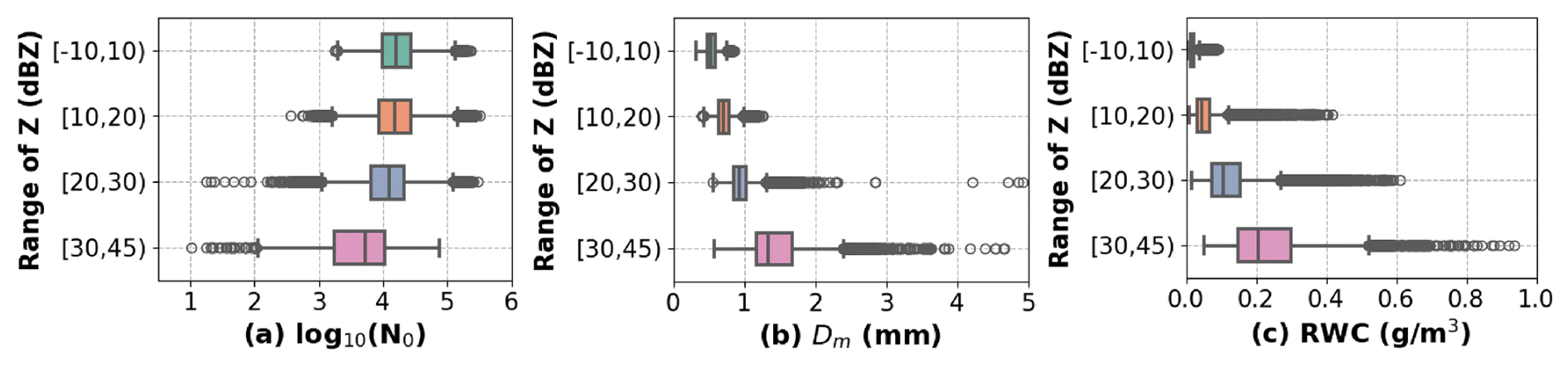 Historical observations of the disdrometer at Hongyuna site from June to August of 2021 to 2023 are used to obtain prior information on the parameters of the MP size distribution of summer rainfall in this region. Based on the observed DSD, the corresponding Z of Ka-band radar is calculated using Eq. (5). The calculated Z values are categorized into four intervals: , [10,20), [20,30), and [30,45). The log 10(N0), Dm and Rain Water Content (RWC) in each Z interval are counted separately and illustrated in Fig. 1. In the box plot used in this paper, the box indicates the Interquartile Range (IQR, 25th–75th percentiles), the horizontal line inside the box denotes the median, and the whiskers extend to the most extreme values within 1.5×IQR. Circles denote outliers beyond the whiskers. RWC is calculated by, . Approximately 113 000 samples of DSD are collected. The results show that the distribution of the log 10(N0) ranges from 1.0 to 5.6. The majority of Dm is less than 1.7 mm. The statistical results indicate that as the Z of precipitation increases, the proportion of larger raindrops of DSD rises, and the concentration of raindrops decreases. Since the RWC is related to the 3-th moment of DSD, it increases as the rain intensity increase and exceeds on average about 0.2 g m−3 at strong echoes (30–45 dBZ).