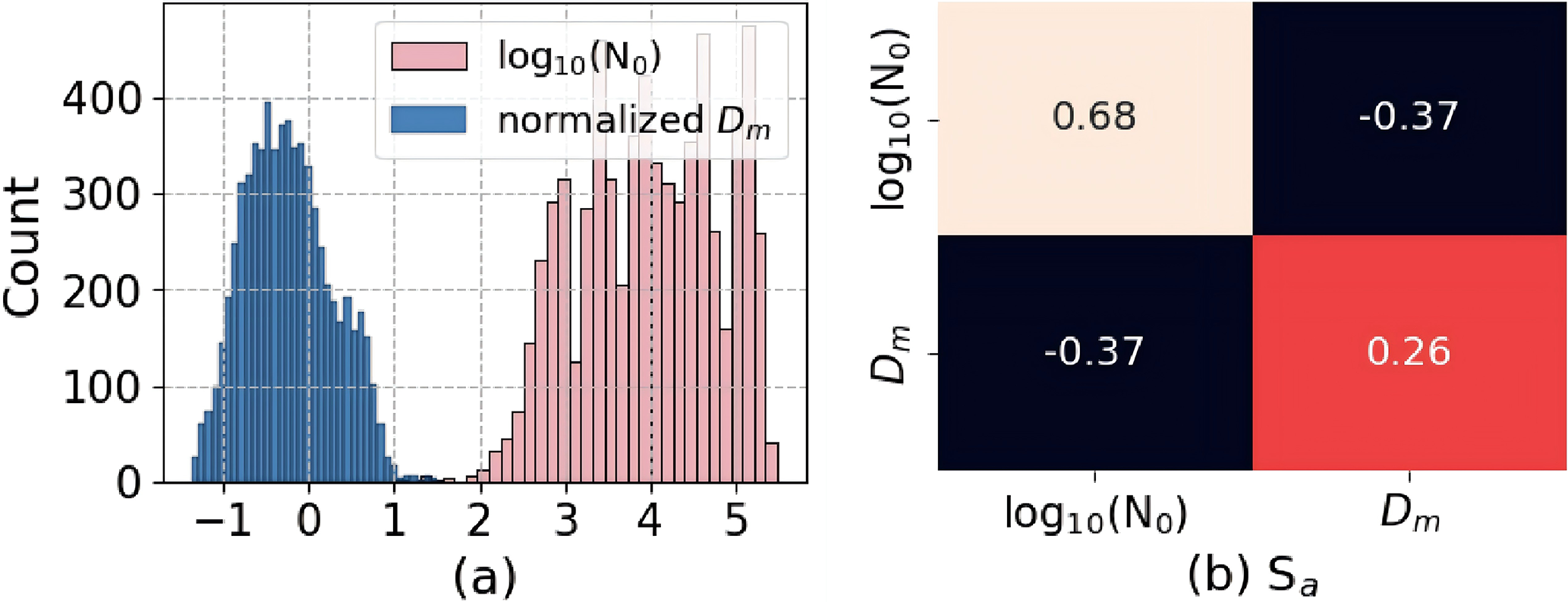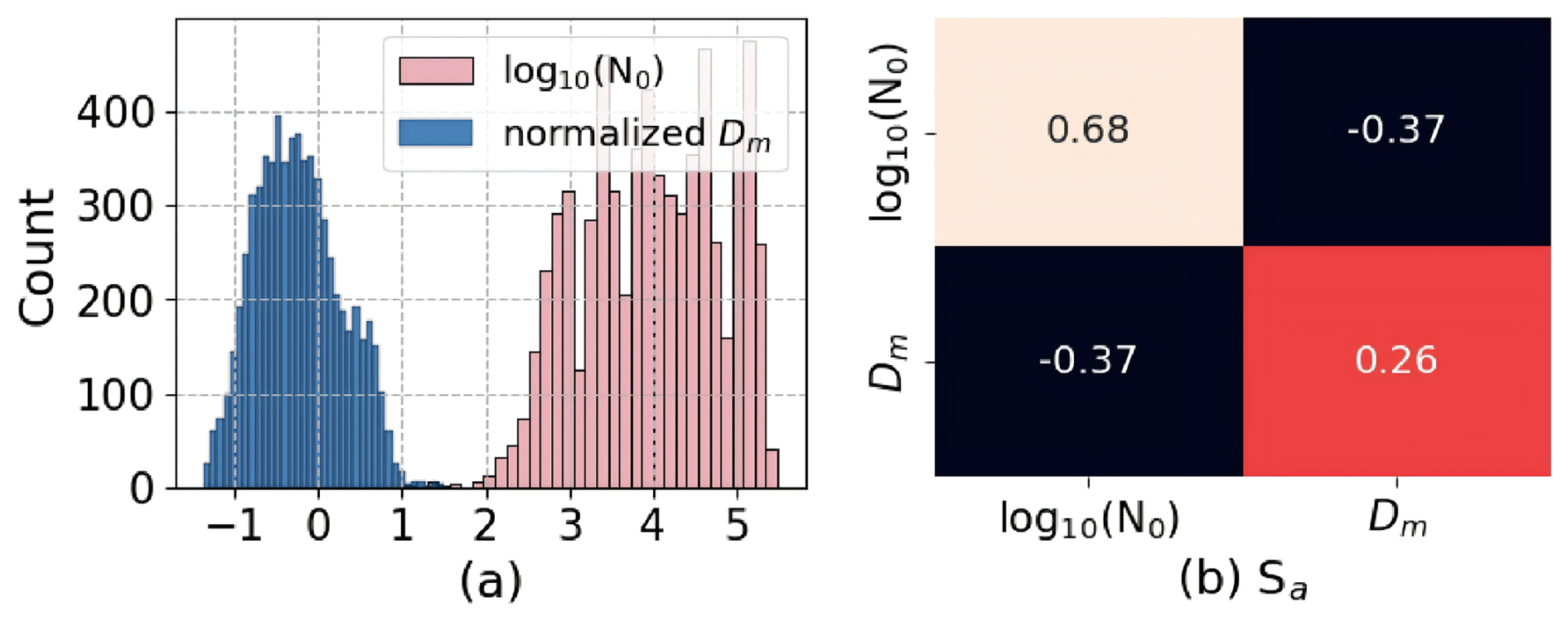 Figure 2The frequency distribution of the prior database and the heatmap of Sa used in the retrieval. (a) Frequency distribution of N0 and normalized Dm, and (b) heatmap of Sa.