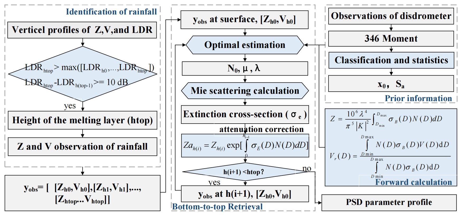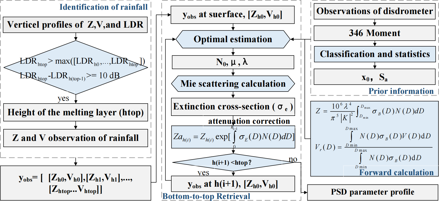 Qe and σe is calculated from the drop size and temperature using the pyQuickBeam software. If the height of the following range gate, h(i+1), is less than htop, the observational vector of the next range gate is updated to . Next, the optimal estimation is used to retrieve the log 10(N0) and the Dm at h(i+1). Following this procedure, the observations of Z are corrected layer by layer, and the N0 and Dm are retrieved bottom to top. The flowchart of the retrieval method is presented in Fig. 3.