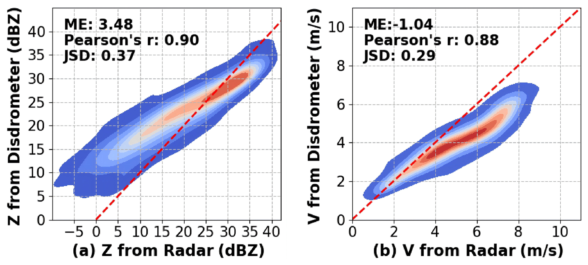 Figure 4 illustrates the true values of Z and Vr observed from the Ka-band zenith-pointing radar and simulated values from the disdrometer during the field campaign in July and August 2024. According to the assessment metrics, the true values and the simulated values of Z and Vr are in good agreement. The ME of Z and Vr is 3.48 dBZ and . The Pearson's r of Z and Vr are above 0.88. For precipitation scenarios with , the Z calculated from the ground-based disdrometer observations generally exceeds the radar measurements. For radar observations with Z≥25 dBZ, the reflectivity factors derived from disdrometer measurements are typically lower than those observed by radar. The simulations and observations for Vr less than 3 m s−1 are consistent, while for Vr exceeding 3 m s−1, the simulations tend to underestimate the values of Vr. JSD values of the simulated and observed suggest some mismatch in Z and Vr distributions. This bias is possibly due to differences in the sampling volumes of the radar and disdrometer, since the disdrometer measures the raindrop at surface and the first effective range bin of radar is at 210 m. In addtion, the wind at the surface may influence the accuracy of the measurements of the disdrometer. Furthermore, as the raindrops fall, they may deviate from the spherical shape assumption in the radar forward model, leading to discrepancy between the forward simulation and observed values.