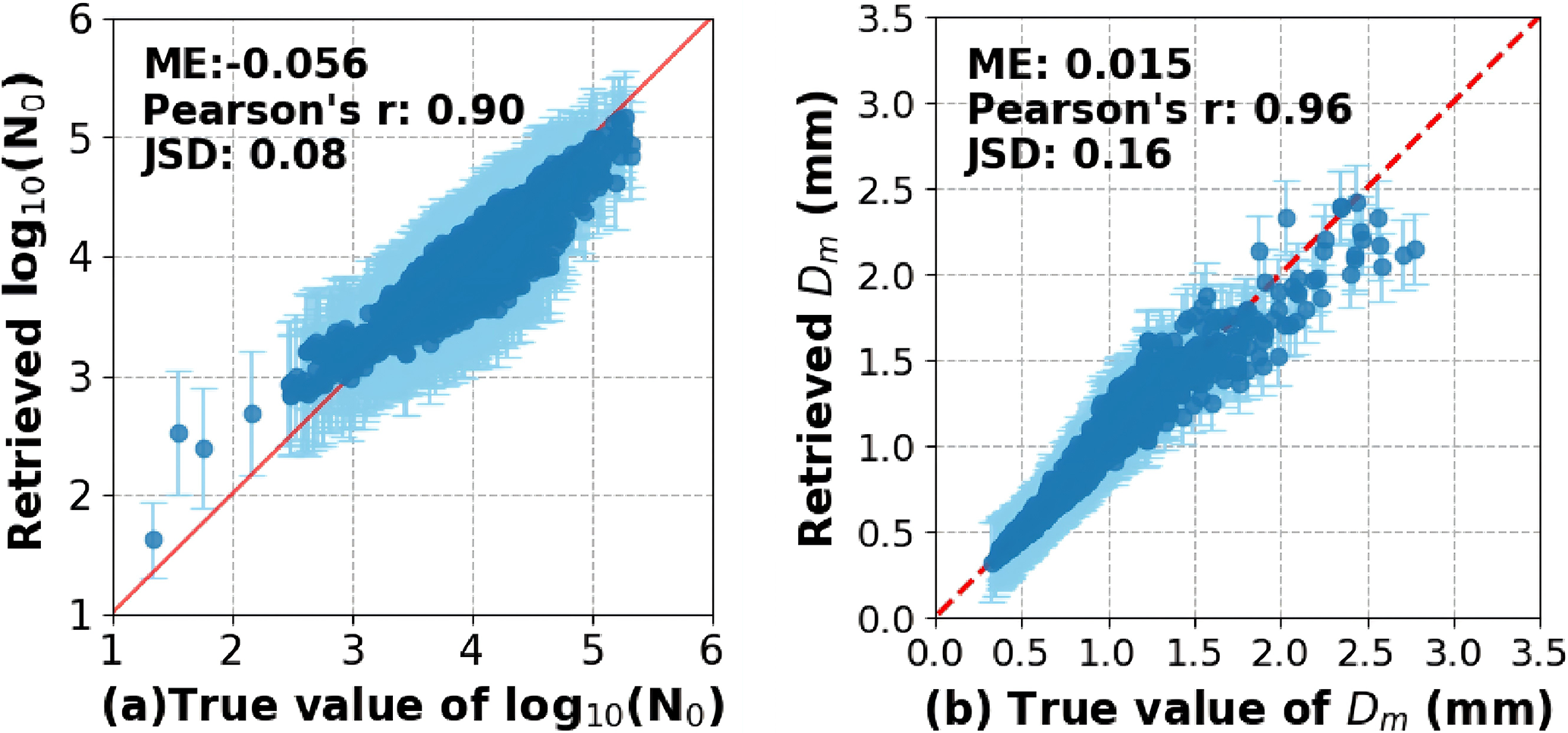To validate the effectiveness of the optimal estimation algorithm, a random stratified sampling of 1800 cases of DSD is selected from the historical observations of the ground-based disdrometers. The precipitation cases were stratified according to the distribution range of N0 and Dm, and 900 cases were sampled for each of the two parameters to ensure that the validation data covered a relatively comprehensive precipitation scenario. Random noise within 0.5 dBZ and 0.5 m s−1 is added to the values of Z and Vr, which are calculated from the selected DSD cases with Eqs. (5) and (6). Then the Z and Vr are taken as the input for the optimal estimation algorithm to retrieve the log 10(N0) and Dm of DSD. The log 10(N0) and Dm derived from the selected DSD with Eq. (3) are taken as the true values of the retrievals. The final value of Sx after retrieval convergence is indicated by error bar in the figure. The comparison of the retrieved values and the true values of log 10(N0) and Dm is presented in Fig. 5. The average bias of the retrieved log 10(N0) and Dm is −0.056 and 0.015 mm, with the average uncertainties of 0.41 and 0.15 mm. The correlation between the retrieved values and the true values of log 10(N0) and Dm both exceeds 0.9. The JSD values of 0.08 and 0.16 indicate a good consistency between the distributions of the retrieved values and the true values of log 10(N0) and Dm. The source of the retrieval errors may be attributed to the random noise added to the Z and Vr. Furthermore, the errors of the retrieval are primarily observed in scenarios where the Dm values exceeded 2.5 mm and the log 10(N0) value is less than 2.6. This may be attributed to the lack of prior information in these cases.