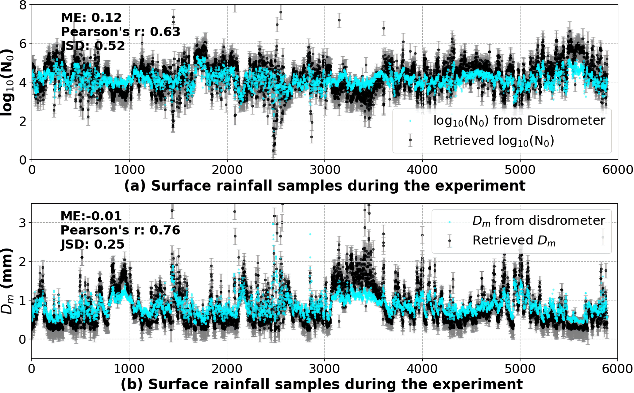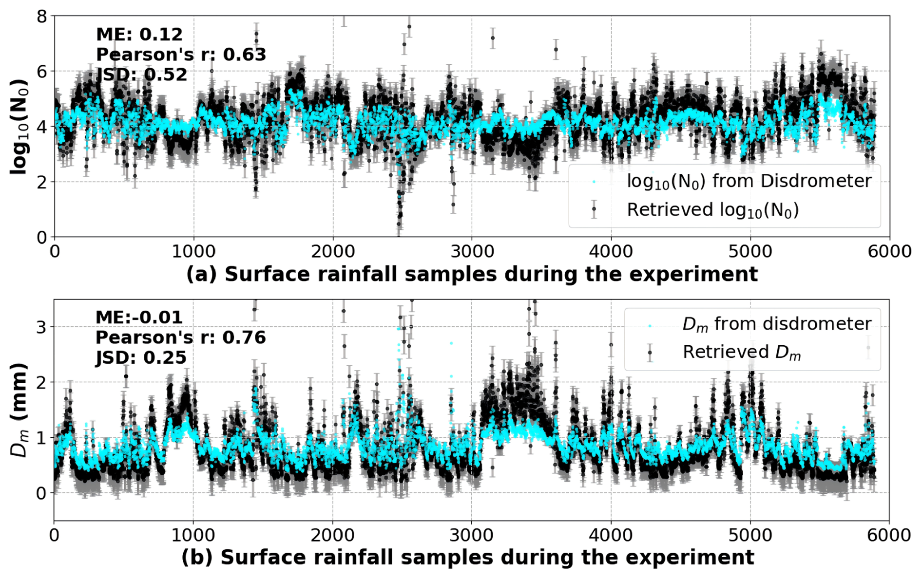 The optimal estimation algorithm is further validated with the observations from the Ka-band zenith-pointing radar and the ground-based disdrometer in Hongyuan during the field campaign in July and August 2024. The Z and Vr observed by radar at h0 are used as inputs for the optimal estimation algorithm. The log 10(N0) and Dm derived from the disdrometer are used for the comparison. Approximately 5900 effective observations of the radar and the disdrometer of precipitation are used for the validation. In Fig. 6, the retrieved values from the optimal estimation algorithm are denoted with black points, while the uncertainties of the retrieval are indicated by error bars in gray. The parameters of DSD derived from the disdrometer observations are marked with blue points. The correlation coefficients between the retrieved and the derived log 10(N0) and Dm are 0.63 and 0.76. The ME of the retrieved and the derived log 10(N0) and Dm are 0.12 and −0.01 mm, and average uncertainties are 0.41 and 0.16 mm, respectively. Most of the log 10(N0) and Dm values derived from the disdrometer are within the uncertainty range of the retrievals. The JSD values indicate that the retrieved Dm values are consistent with the distribution of the observations of the ground-based disdrometer. The bias between the retrieved and observed parameters of DSD may be attributed to the observational uncertainties and the differences in the sampling volumes of the two instruments, as well as errors introduced when fitting the DSD parameters. More importantly, based on the validation of the radar forward calculation, there is a bias between the radar observation and simulation. Physical assumptions in the scattering calculations, such as the spherical-drop approximation, may also contribute to discrepancies between the retrieved values and the surface DSD parameters.