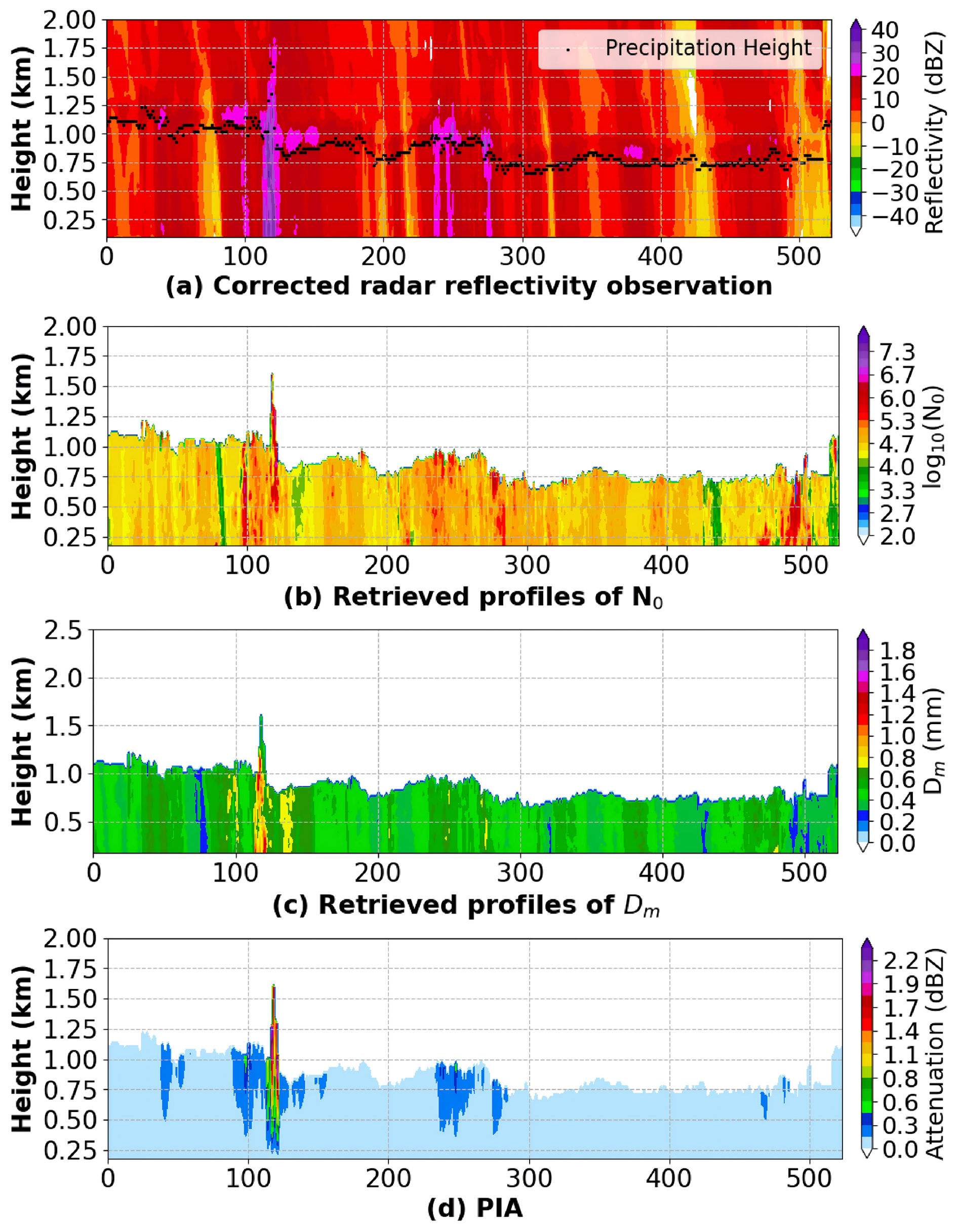 After determining the height of the precipitation layer, the parameters of the DSD are retrieved from bottom to top. For each range gate of the radar observation, the optimal estimation method is used to retrieve log 10(N0) and Dm from Z and Vr.