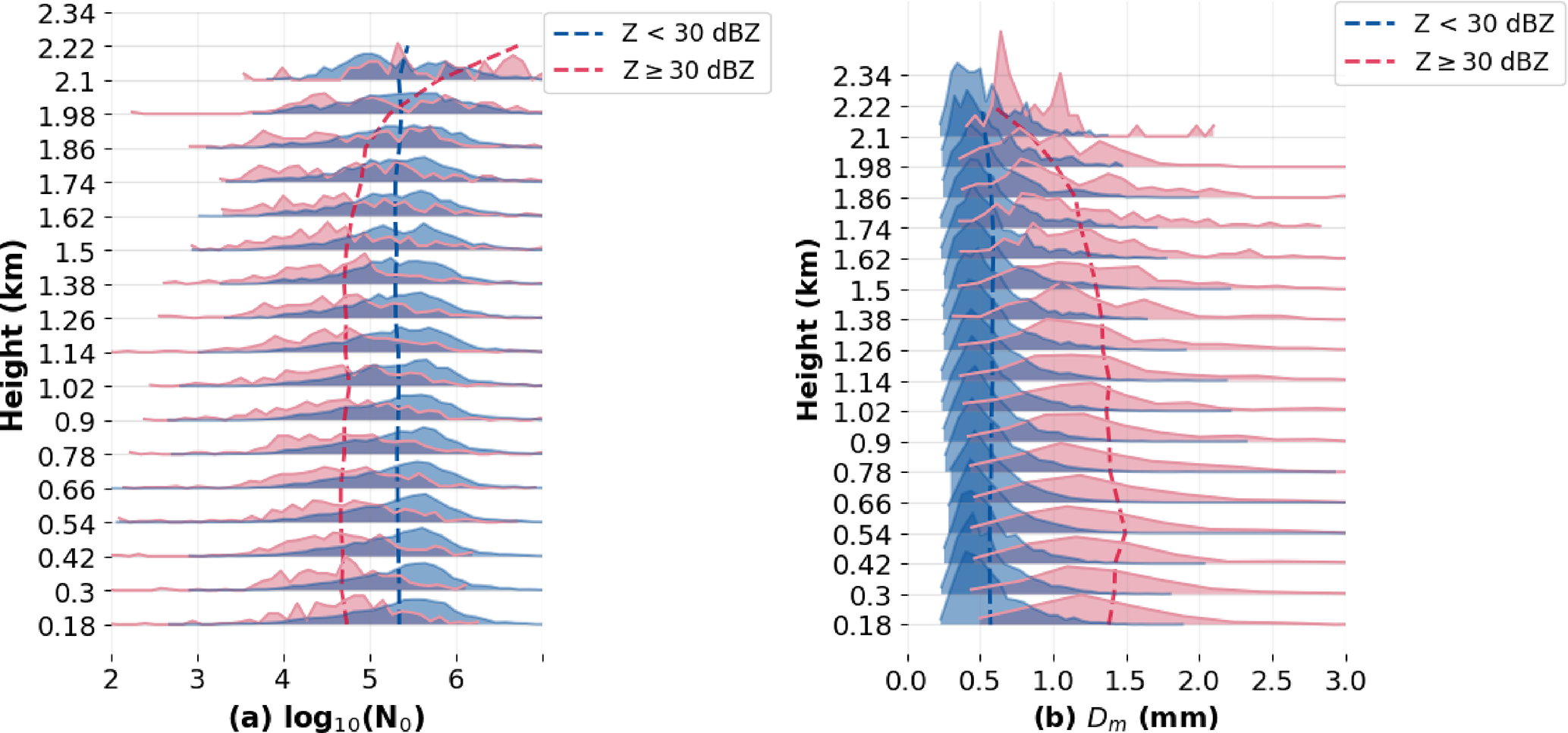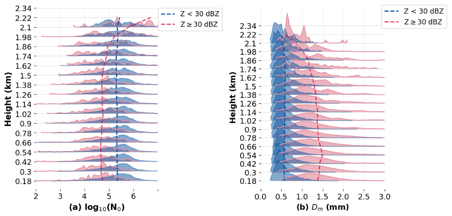 Figure 8 presents the distribution and the mean values of DSD parameters with height during July to August 2024 at Hongyuan. The maximum Z in the profile is used as an indicator of the heavy precipitation. If the indicator is larger than or equal to 30 dBZ, the precipitation sample is identified as heavy precipitation. As shown in Fig. 8a, the mean values of the log 10(N0) for heavy precipitation are notably higher above 2 km, indicating a larger particle concentration at higher altitudes of heavy precipitation. At altitudes below 1.9 km, the mean values of the log 10(N0) are lower than those of other lighter precipitation. This is consistent with the prior information that the particle concentration is lower in heavy precipitation. The mean values of log 10(N0) and Dm for lighter precipitation show vertical variation. According to the statistical results for the Dm parameter, the mean values of Dm for both heavy and lighter precipitation above 2 km are approximately 0.5 mm. This may suggest that raindrops begin to detach from the cloud layer (Barthazy et al., 1998). The mean Dm for heavy precipitation is generally larger than lighter precipitation, and increases as the raindrops fall, reaching a peak at around 0.5 km. This may relate to the equilibrium of coalescence and breakup effects of raindrops during their falling process (Gatlin et al., 2018).