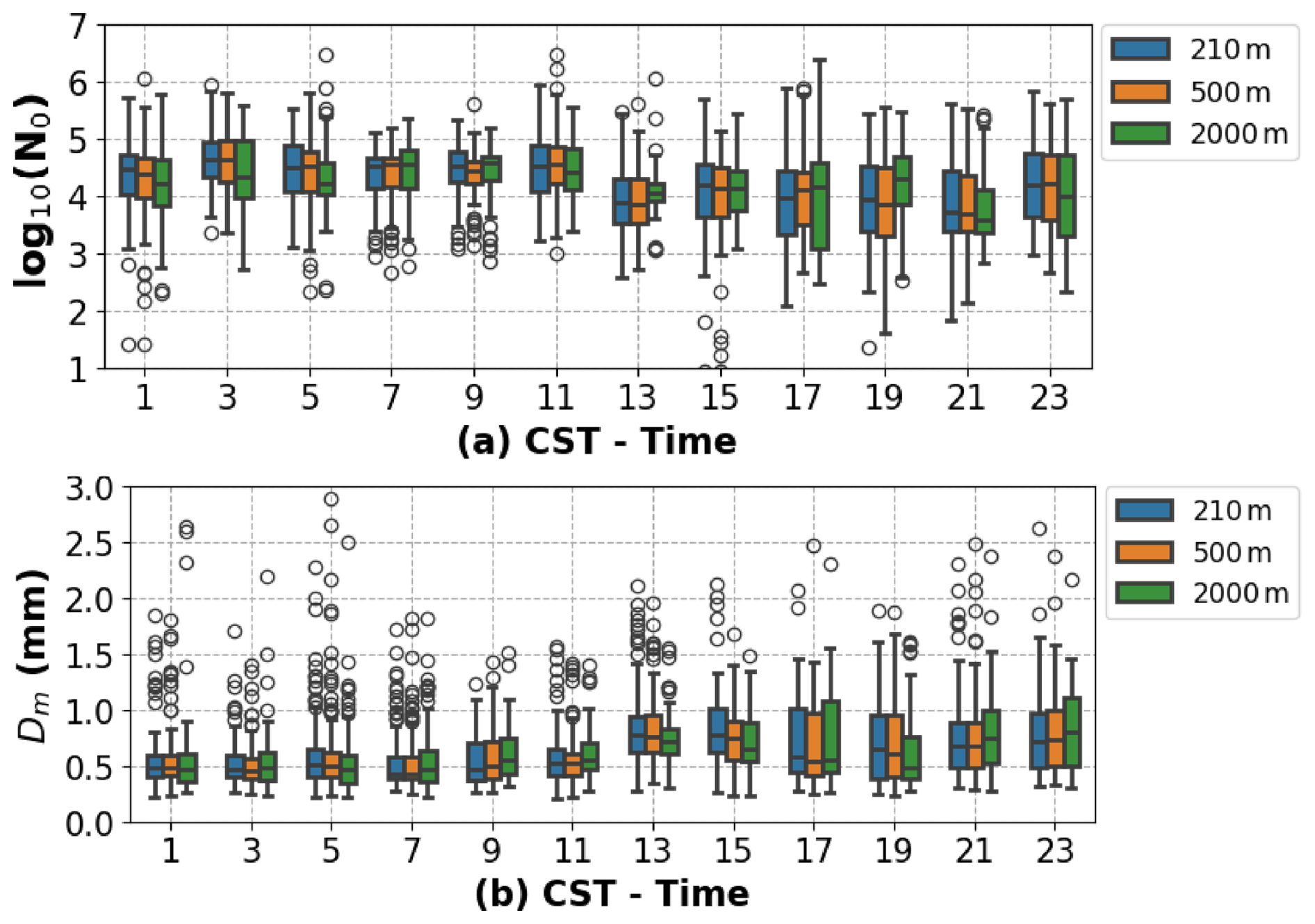 Figure 9 presents the diurnal distribution of DSD parameters at heights of 210, 500, and 2000 m. The daytime in the Hongyuan region is longer than the nighttime in summer. The sunrise occurs around 06:20 CST in the morning, and the sunset around 20:30 CST. Usually, the precipitation intensity in this area in the afternoon is higher than that after the cooling at nighttime (Liu and Yin, 2001). The broader distribution for the log 10(N0) and Dm parameters exhibits around 17:00 CST, likely associated with the convective precipitation that occurs during the afternoon. The mean value of the log 10(N0) parameter at three different heights between 12:00 and 22:00 CST is lower than other times. This may relate to prior information on the DSD, which suggests that heavy precipitation typically has lower log 10(N0) values. The Dm have larger mean values between 13:00 and 24:00 CST at three different heights, indicating that the sizes of raindrops are generally smaller during the nighttime. This is consistent with the previously summarized features of DSD of lighter precipitation.