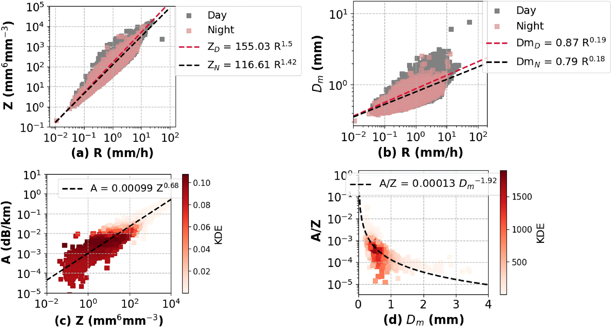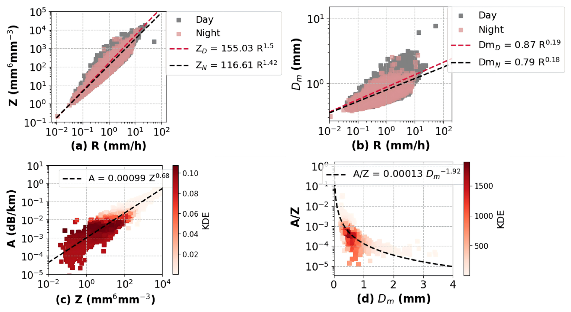 Figure 10Empirical relations for QPE and attenuation correction using Ka-band radar in the eastern Tibetan Plateau. (a) Z-R relation. (b) Dm-R relation, (c) Z-A relation. (d) Dm- relation, where A refers to the specific attenuation in dB km−1, Z in mm6 m−3.