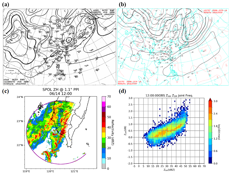 Figure 1Synoptic-scale and meso-scale observations of the SoWMEX IOP8 squall line case at 12:00 UTC on 14 June 2008. Synoptic-scale: (a) surface weather map and (b) 500 hPa analyses weather map from the Central Weather Administration (CWA). Meso-scale: (c) reflectivity at 1.1° elevation, observed by SPOL, and (d) ZHH–ZDR joint frequency.