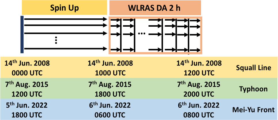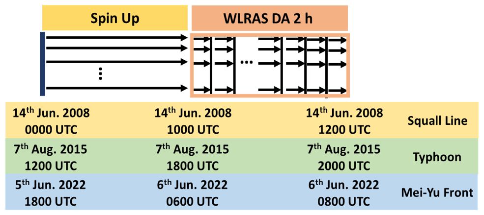 In this study, real case data assimilation experiments on summertime rainfall events are conducted to evaluate the influence of the employed specific operator configuration. Three cases are selected, including a squall line case, a typhoon case and a Mei-Yu frontal case (stationary frontal case), to validate the simulations for various weather types.