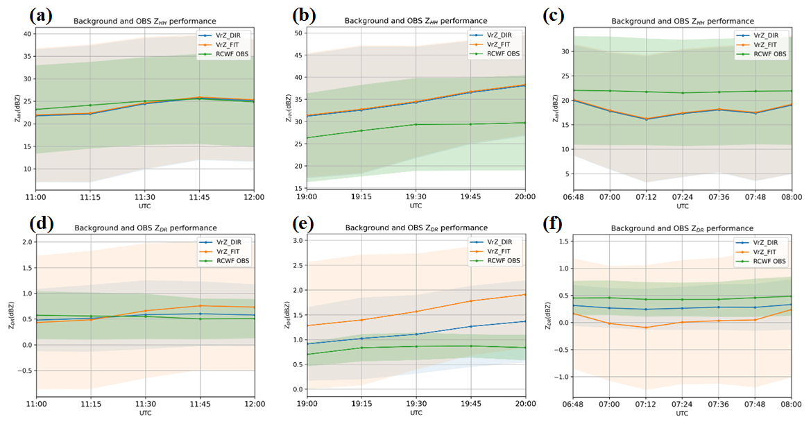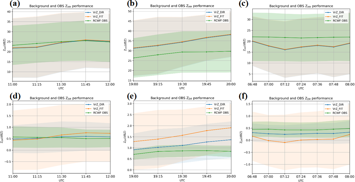Although the validations above suggest that the VrZZ_DIR experiment has a more reasonable simulation compared to the VrZZ_FIT experiment, there is still a difference between the VrZZ_DIR simulation and the observation. For instance, the occurrence frequency in the VrZZ_DIR experiment of ZDR is overestimated for the typhoon case when ZHH>30 dBZ. Besides, the joint frequency distribution in the VrZZ_DIR experiment is narrower than the one from observation data, indicating that the operator could not appropriately describe the degree of freedom in the observation. However, the ZDR overestimation and narrow distribution in the VrZZ_DIR experiment could be modified after the assimilation, leading to a more reasonable structure compared with that obtained in the VrZZ_FIT. In sum, the clear difference in the ZHH–ZDR structure in the background limits the adjustment of assimilation in the VrZZ_FIT experiment, and the similar ZHH–ZDR structure in the VrZZ_DIR background leads to a more reasonable structure in the analyses.