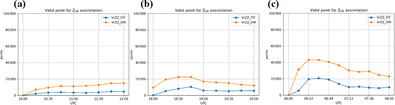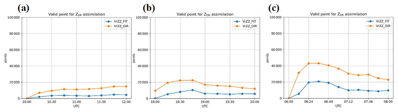 Figure 8Valid points for ZDR assimilation calculated in VrZ analyses when different operators are used in the (a) squall line case, (b) typhoon case, and (c) Mei-Yu frontal case. Blue and orange respectively indicates the performance when the fitting method and direct integration method are used.