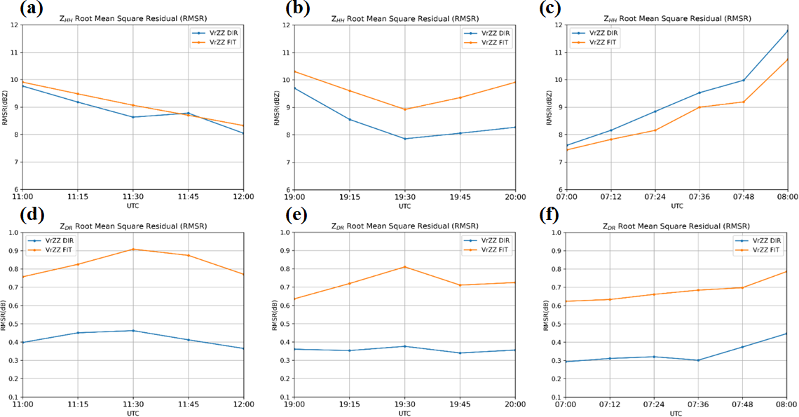 This section presents the validation of simulated variables from the LETKF forecasts and analyses. Figure 9 shows the observed and analyzed reflectivity at the final analysis time. Compared with the observations, both experiments successfully reproduce the overall structure of the precipitation systems after assimilating dual-polarization radar data and exhibit similar performance across the three cases. However, both experiments slightly underestimate the intensity of the system, particularly in the squall-line case and in the VrZZ_FIT experiment for the typhoon case. In contrast to reflectivity, the analyzed ZDR exhibits more distinct differences between the two experiments (Fig. 10). Compared with the observation, VrZZ_DIR has a reasonable ZDR distribution and is able to capture the main structural features of the system, although the ZDR intensity is still overestimated in the Mei-Yu frontal case. By comparison, VrZZ_DIR experiment shows poorer performance in simulating ZDR failing to adequately represent its intensity, with overestimated extreme values and underestimated ZDR in the surrounding regions of the system. To quantitative evaluate the model, the difference between observation and simulation data, root mean square residual (RMSR), is calculated as follows: