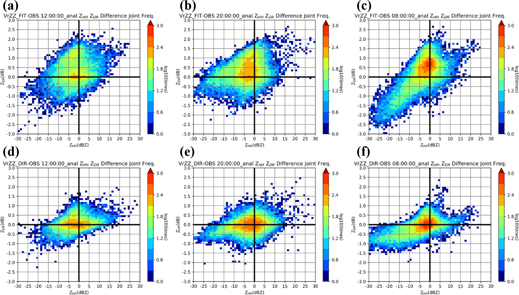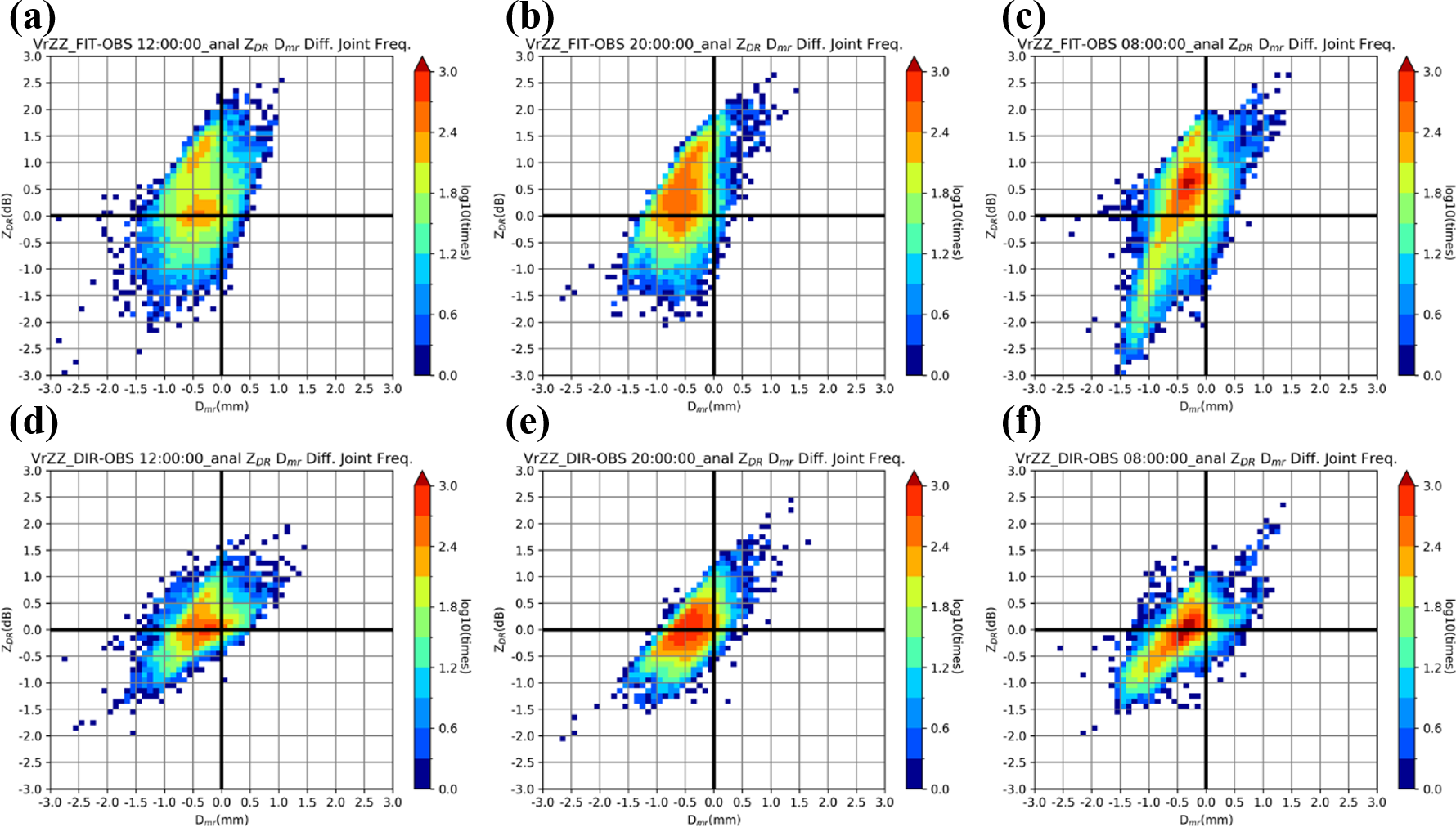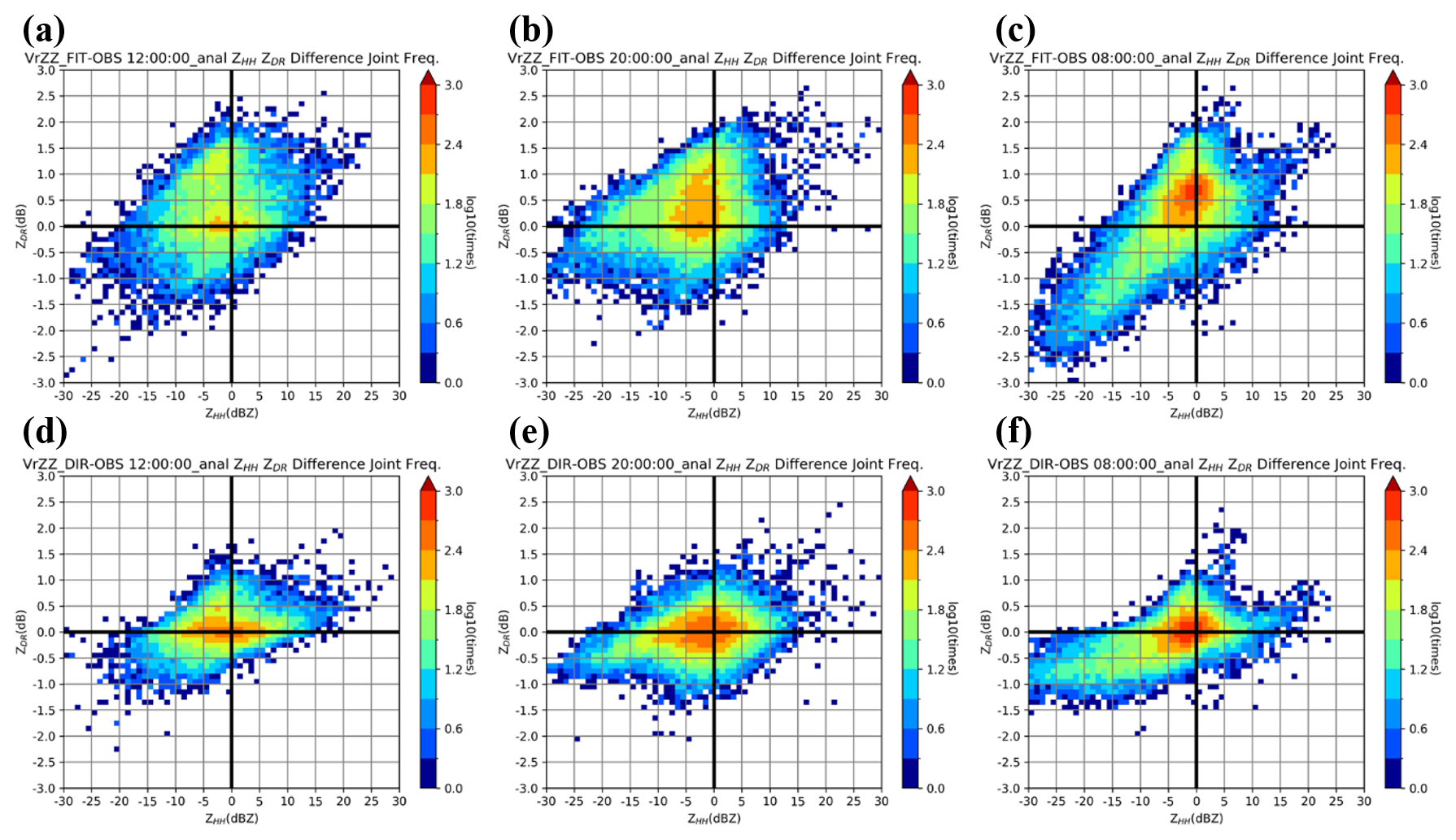 Figure 12ZHH–ZDR difference joint frequency at the final analyses of the (a–c) VrZZ_FIT and (d–f) VrZZ_DIR experiments for the (a, d) squall line case, (b, e) typhoon case, and (c, f) Mei-Yu frontal case. The shading indicates the occurrence times of the difference calculated from the observation and simulation on the logarithmic scale. The horizontal and vertical axes are the ZHH and ZDR difference with 1 dBZ and 0.1 dB intervals, respectively.