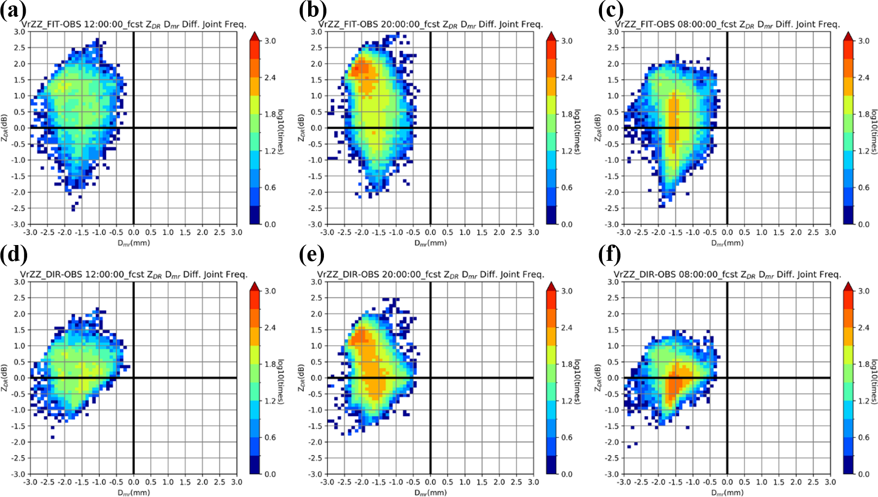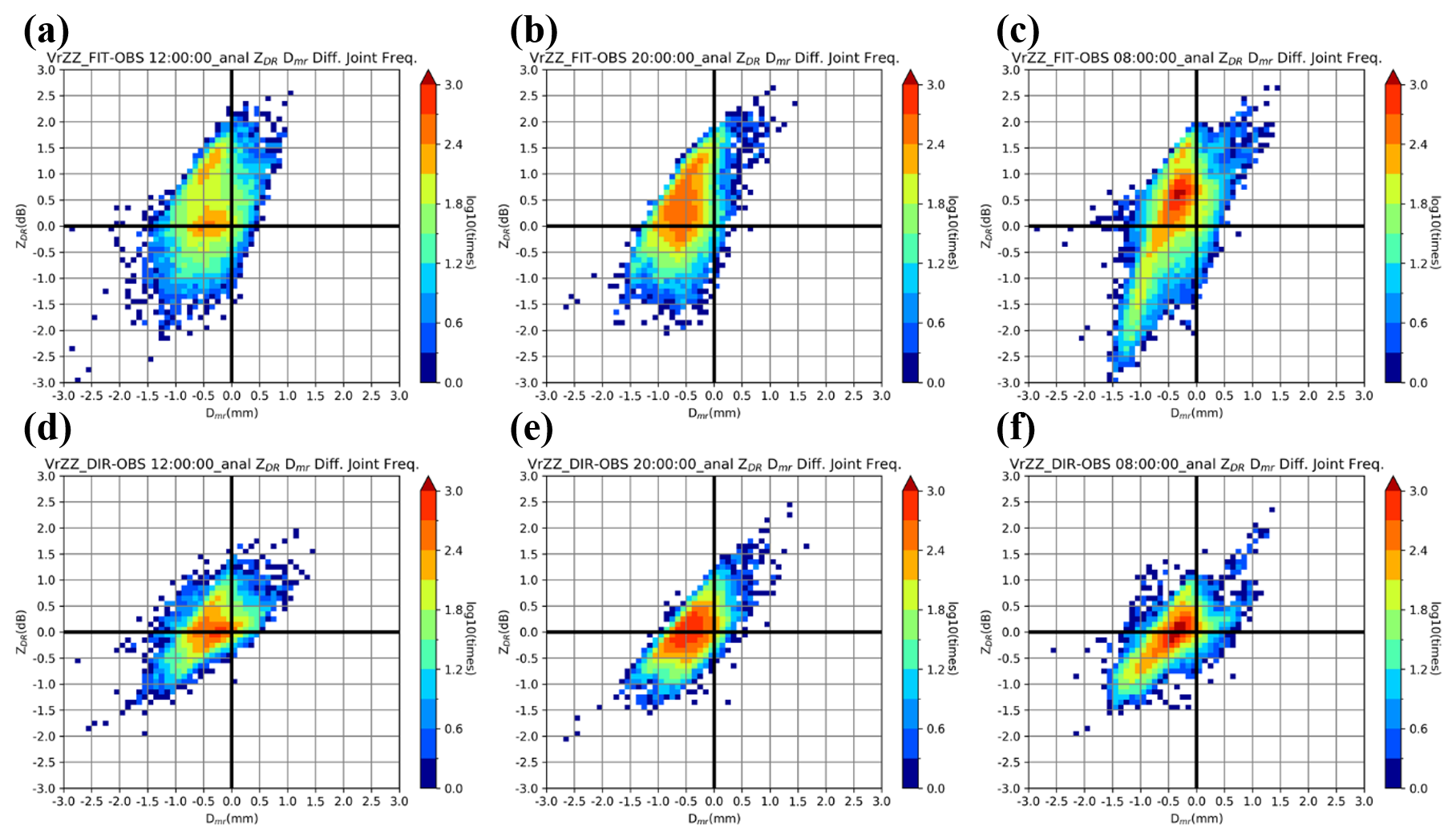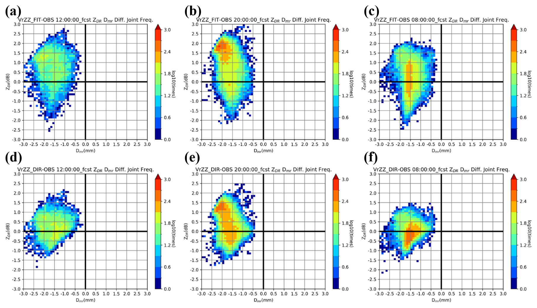 Figure 12ZHH–ZDR difference joint frequency at the final analyses of the (a–c) VrZZ_FIT and (d–f) VrZZ_DIR experiments for the (a, d) squall line case, (b, e) typhoon case, and (c, f) Mei-Yu frontal case. The shading indicates the occurrence times of the difference calculated from the observation and simulation on the logarithmic scale. The horizontal and vertical axes are the ZHH and ZDR difference with 1 dBZ and 0.1 dB intervals, respectively.