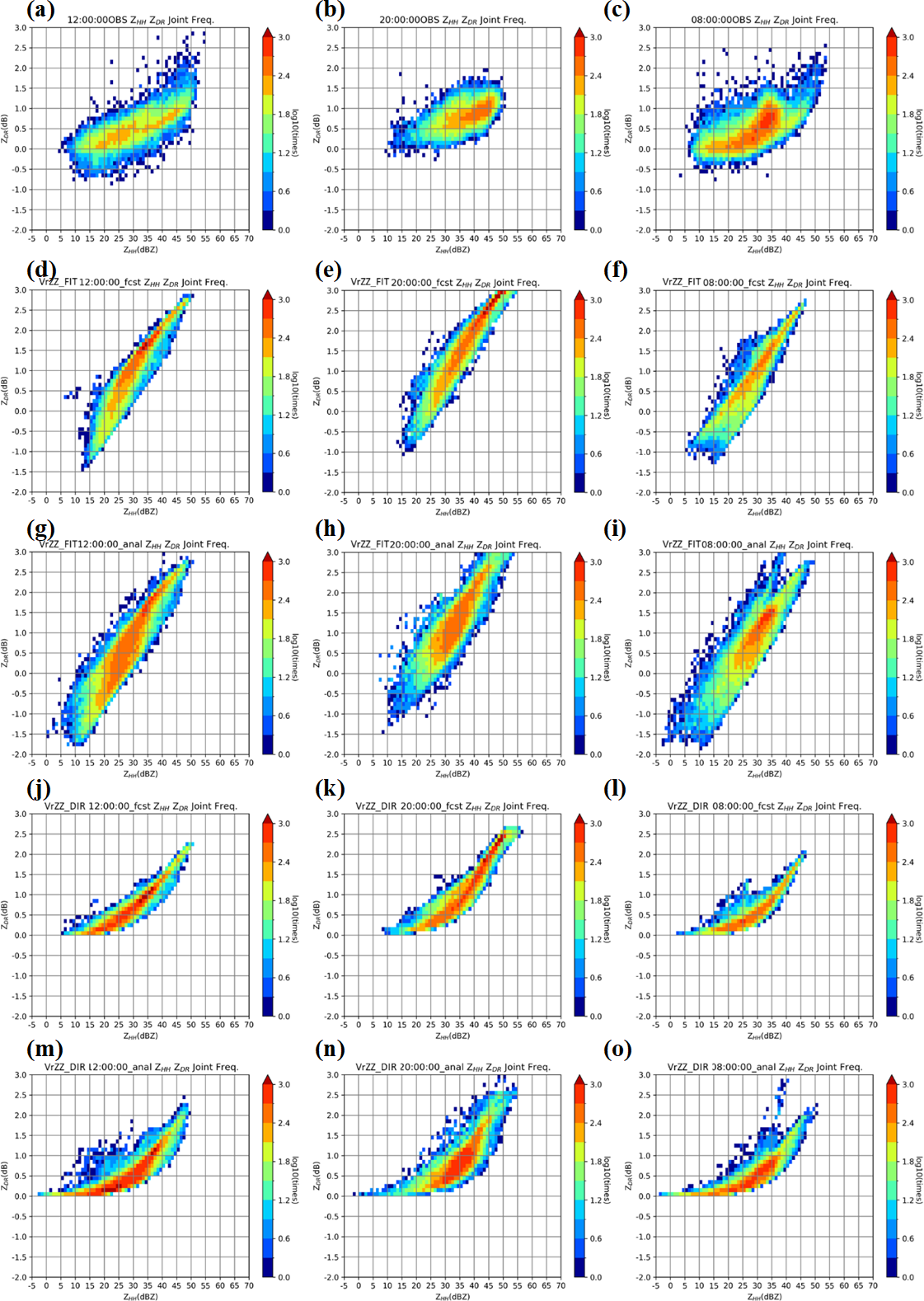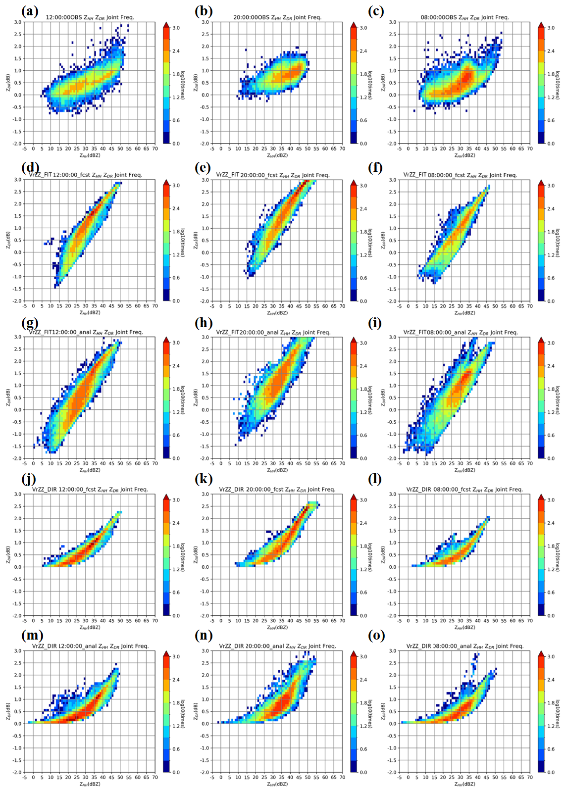 Figure 13ZHH–ZDR joint frequency at the time of the final analyses in the (a–c) observation, (d–f) VrZZ_FIT background, (g–i) VrZZ_FIT analyses, (j–l) VrZZ_DIR background, and (m–o) VrZZ_DIR analyses for three cases: squall line (left column), typhoon (middle column) and Mei-Yu frontal case (right column). The shading is the occurrence times on the logarithmic scale. The horizontal and vertical axes are the ZHH and ZDR with 1 dBZ and 0.1 dB intervals, respectively.