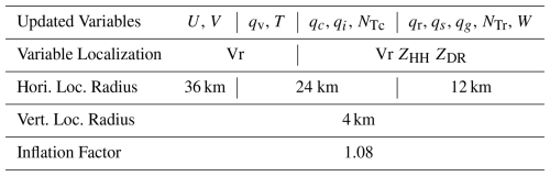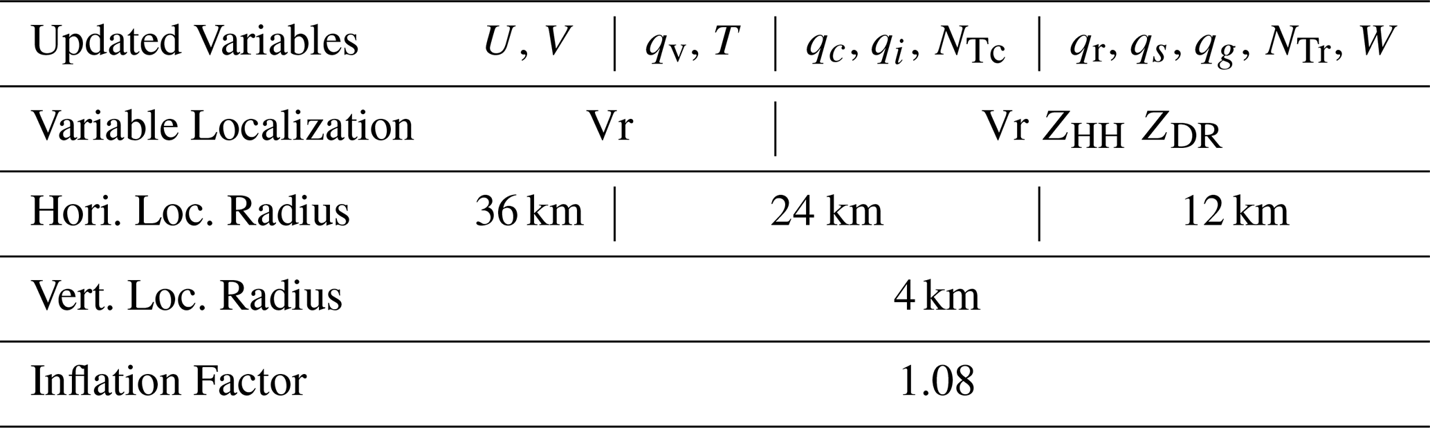 Although dual-polarization radar data and model simulation can describe the microphysical evolution of hydrometeors during rainfall periods, the limitations of MP schemes lead to simulation errors, and the radar observations may have uncertainty, even when subjected to quality control. To theoretically reduce the errors and come close to the true state, data assimilation (DA) should be employed to statistically adjust the model toward the true state with the weightings made by observation and background error structure, providing more accurate initial conditions for numerical forecasts. Doppler radar data, including reflectivity and radial velocity data, have been assimilated using variational method (VAR) or ensemble Kalman filter (EnKF) to capture the rapid evolution of a system (Sun and Crook, 1997; Snyder and Zhang, 2003; Zhang et al., 2004; Xiao et al., 2005; Chung et al., 2009; Chang et al., 2014, 2016; You et al., 2020). Compared to the VAR, the EnKF uses ensemble simulations to estimate background error covariance that makes the flow-dependent structure without backward integration. Furthermore, with the EnKF, innovation could be transferred from observation space to model space without the need to use an adjoint operator, which renders the EnKF suitable for complex and non-linear observation operators, especially dual-polarization radar observation operator. However, for the operational applications, the ensemble size often constrained by due to the high computational cost, leading to the sampling error and the unreasonable long-distance error correlation. To prevent unreasonable model updates caused by such spurious covariance, the Local Ensemble Transform Kalman Filter (LETKF) applies a localization radius to limit the observations used in the assimilation at each grid point (Hunt et al., 2007; Ott et al., 2004). By updating the model state independently at each grid point, the LETKF is amenable to parallel computation that is favorited for researcher and operation centers (Miyoshi et al., 2010; Hamrud et al., 2015; Gastaldo et al., 2021; Reimann et al., 2023). In addition, similar to the Ensemble Square-Root Filter (EnSRF; Whitaker and Hamill, 2002) and the Ensemble Adjustment Kalman Filter (EAKF, Anderson, 2001), the LETKF is a deterministic EnKF that does not require perturbed observations. Compared with the traditional stochastic EnKF, this approach helps avoid sampling errors caused by perturbed observations (Tippett et al., 2003). Building upon the LETKF framework, Tsai et al. (2014) implemented the mixed localization radius approach in the WRF-LETKF Radar assimilation system (WLRAS; Tsai et al., 2014) in which different localization radii are applied to different categories of model state variables. Since the dynamic and thermodynamics variables have larger spatial correlation than the microphysics variables, with assigning suitable localization radii to update different variables, the precipitation forecasts would be improved (Tsai et al., 2014).