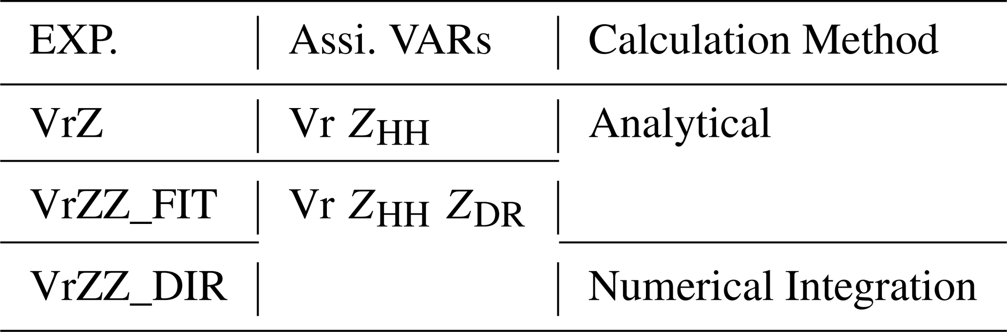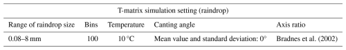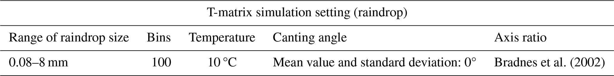 The direct integration method can also be employed in calculating the raindrop-contributed reflectivity factor and is compared with the power-law fitting method in this study. The T-matrix method is applied to simulate the scattering amplitude with respect to different raindrop sizes. The environmental conditions of the T-matrix simulation, including temperature, canting angle, and drop size bin intervals, are set on the basis of the setting in Jung et al. (2010) and are presented in Table 2. Finally, the factors of the raindrop-contributed reflectivity factors on both axes are derived by directly integrating the raindrop number concentration and scattering amplitude with respect to the drop size diameter.