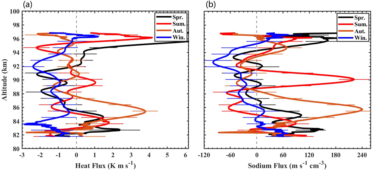 Figure 14The seasonal profiles of the heat (a) and Na (b) fluxes. Spring (black), summer (red), autumn (orange), winter (blue). Error bars are shown as thin lines.