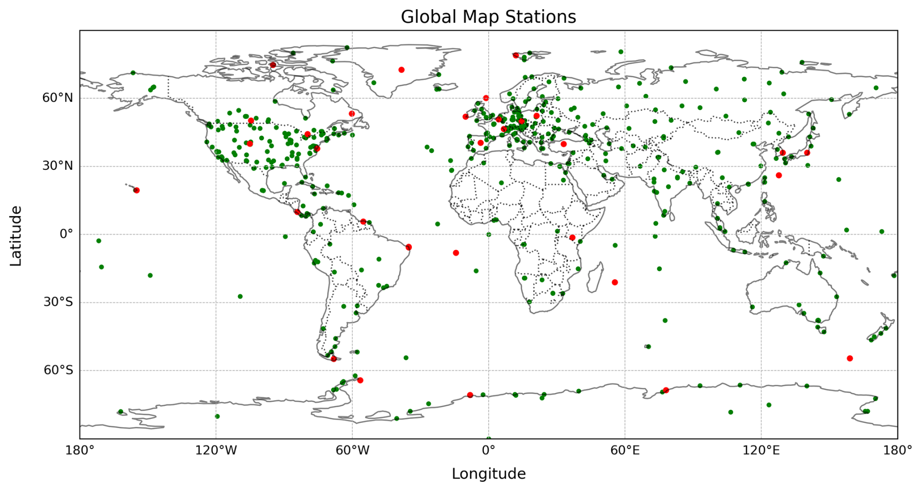 Figure 1Global map of WOUDC stations (green markers). Red markers identify stations effectively used in this study.