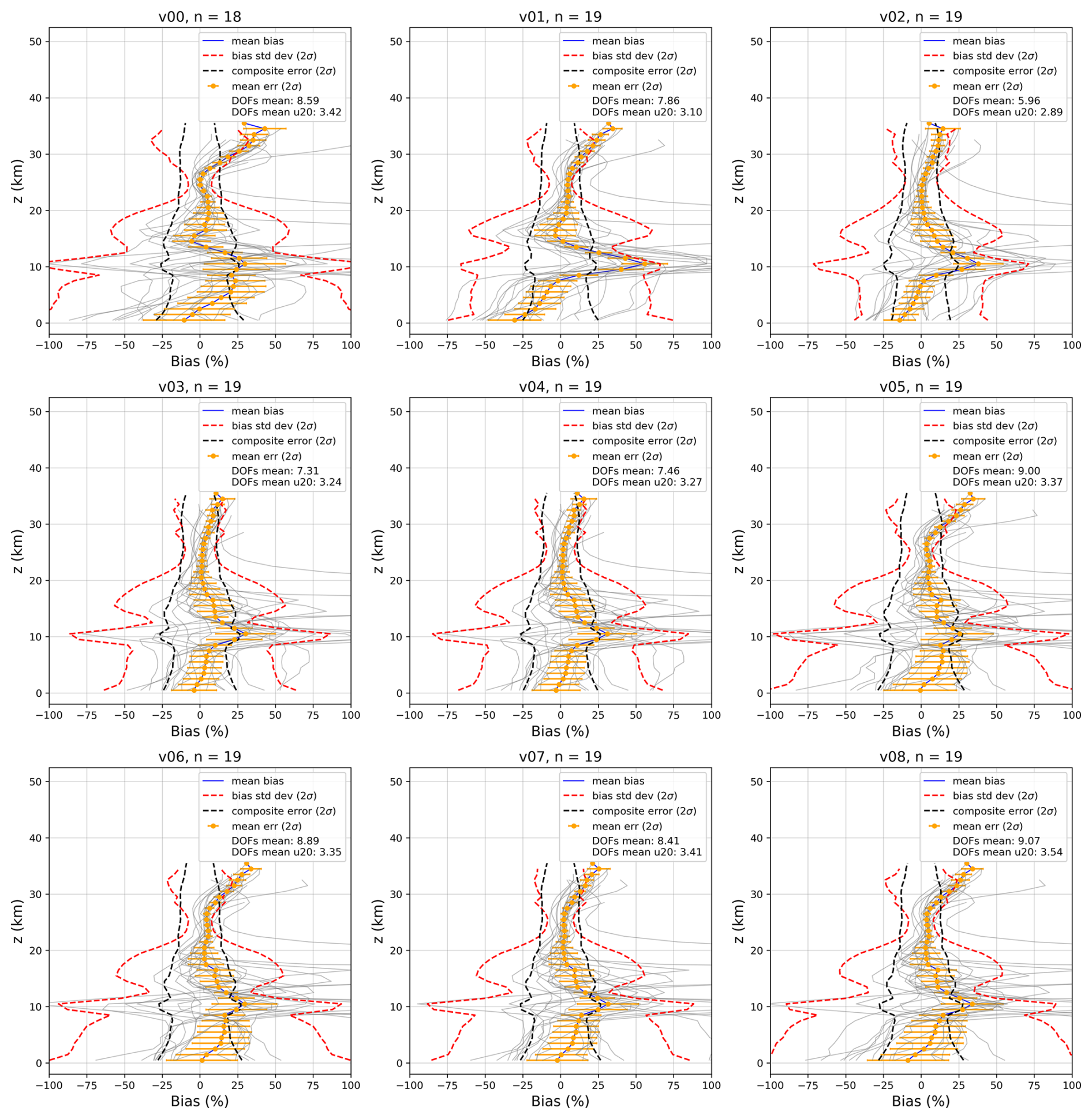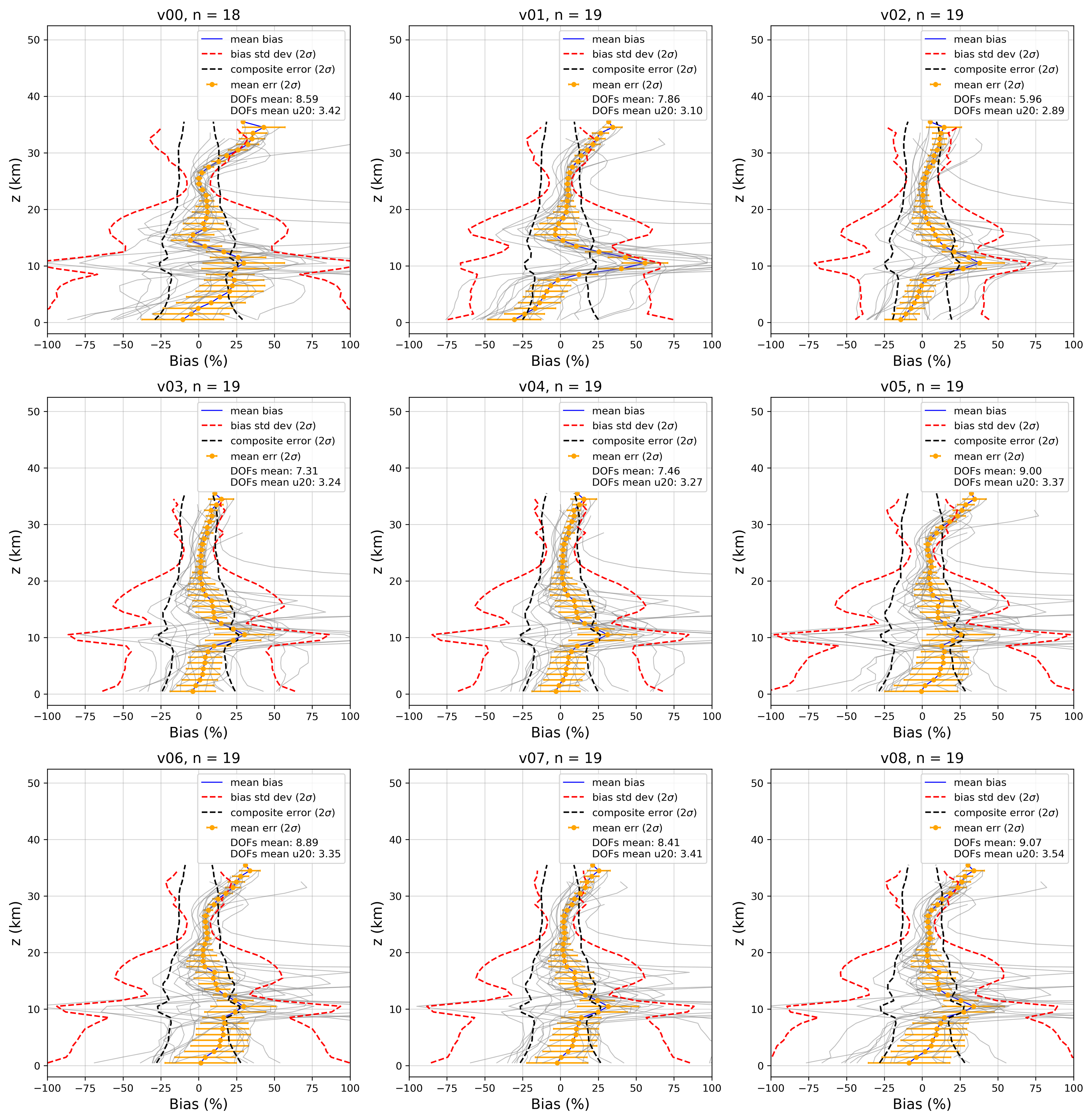 Figure 2 shows the validation results for the nine proposed versions of the fusion method. All versions exhibit a bias peak around 10 km, which is mainly inherited from the IASI dataset due to its vertical sensitivity structure and retrieval characteristics, as explained at the end of this section. However, this peak is reduced (by less than 25 %) in version v05. Bias alone is not sufficient to determine the best-performing version. Due to the different constraints applied in each version, some profiles exhibit oscillatory behavior or even negative values. These negative values do not have physical meaning; they arise from the retrieval process, particularly in regions of low sensitivity or very low ozone abundance, and reflect the limitations of the inversion algorithm combined with measurement noise. Although such values are occasionally kept to mantain statistical integrity of the dataset, their occurrence rate was adopted as a further criterion for assessing the quality of each version. Consequently, each version may have a different number of valid profiles. The quantity n in Fig. 2 shows, for each version, the number of profiles contributing to the mean. More strongly constrained versions generally exhibit fewer negative values. However, a stronger constraint typically reduces the information content of the profiles, and thus the number of DOFs. To improve the statistical robustness of the analysis, this aspect together with DOFs was also assessed using a larger dataset, selecting six random days in 2008 and including all fused profiles within the region, rather than only those coincident with ozonesondes.