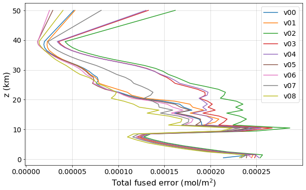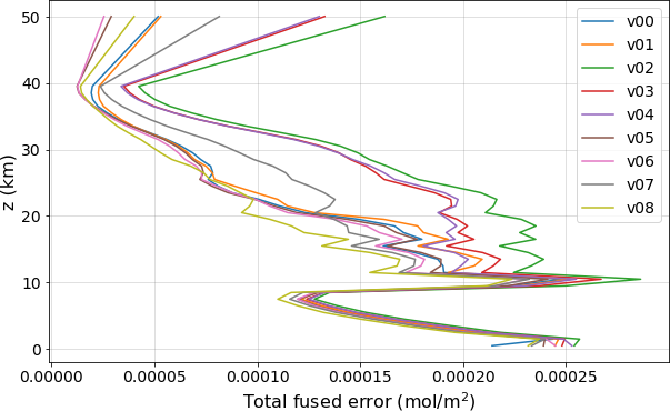 As these equations suggest, the performance of the CDF method depends on the quality and consistency of the input profiles. However, it offers several advantages. First, it allows for greater control over the a priori constraint imposed on the fused product, which can theoretically be chosen independently of the a priori constraints of the Level 2 products being merged. Second, it handles profiles on different grids, and allows for fusion onto an arbitrary target grid. By combining information from the Level 2 products while removing their individual constraints, the method enables the generation of a product with potentially higher information content and lower uncertainty. As a diagnostic method for the fusion process compared to each L2 input, the number of degrees of freedom (DOFs), given by the trace of the AK, can serve as a measure of vertical information content. Moreover, the diagonal elements of the AK can be analyzed to assess whether and where vertical resolution increases, and errors can be evaluated as the square root of the diagonal elements of the CM. Finally, the CDF method inherently requires consistency among input data, thereby also providing a means for verifying their quality.