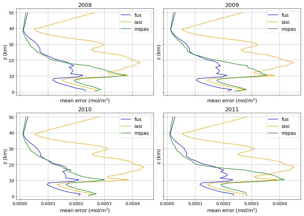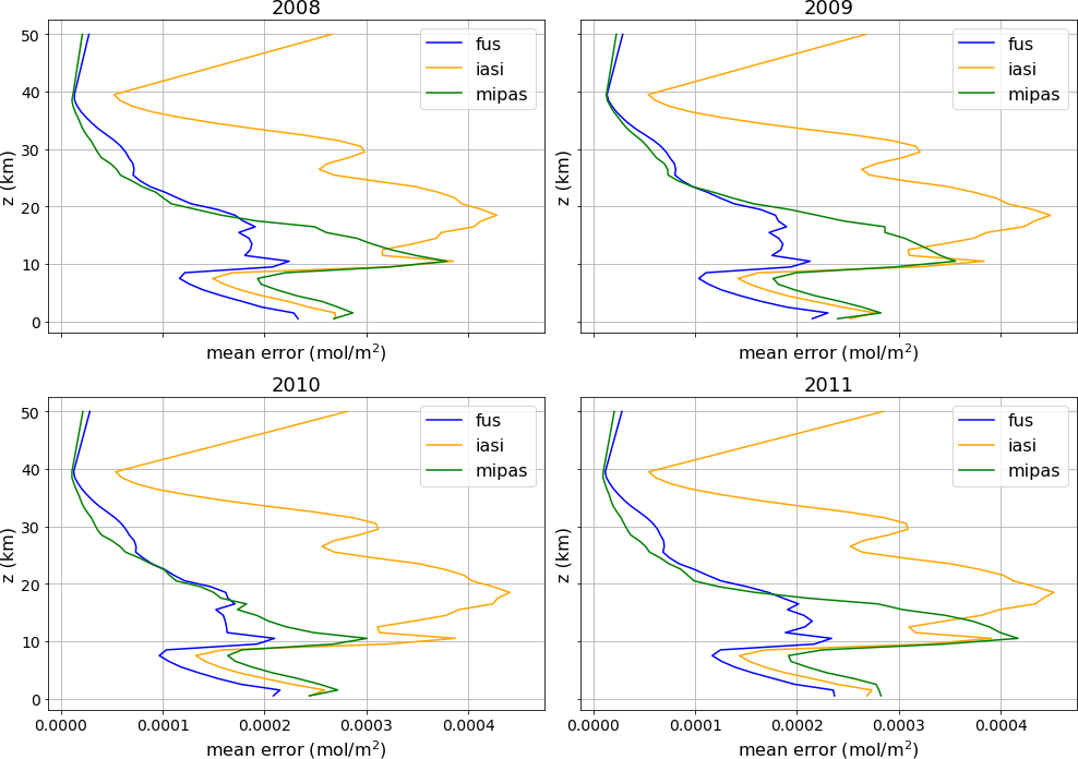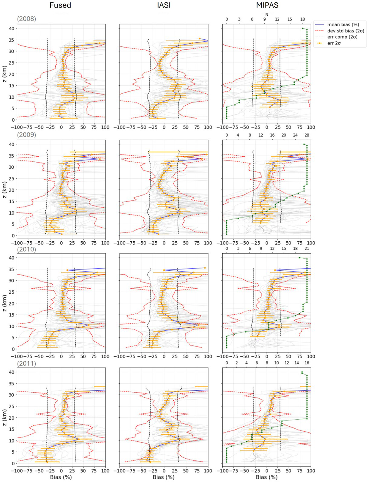 Finally, the comparison between L2 and fused mean total errors (Fig. 5) shows that the fused product exhibits lower errors than each L2 product in the UTLS region, and more generally below 18 km in all years. Above 18 km, the fused error is much lower than that of IASI and comparable to that of MIPAS, where MIPAS performs best. The slightly higher fused error compared to MIPAS is likely due to additional uncertainties introduced during CDF processing, such as co-location and interpolation errors. The error profile is fundamentally shaped by the limitations and synergies of the individual sensors. The prominent peak at 10 km is a feature of the IASI retrieval, arising from its reliance on a priori information at lower altitudes. Although this peak is imposed on the regridded MIPAS data during comparison, the fused product successfully overcomes this limitation. The synergy of IASI and MIPAS not only diminishes the peak but also achieves lower errors above 10 km, where MIPAS measurements provide a substantial improvement.