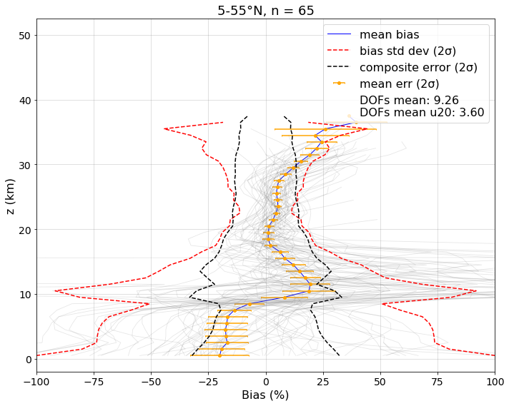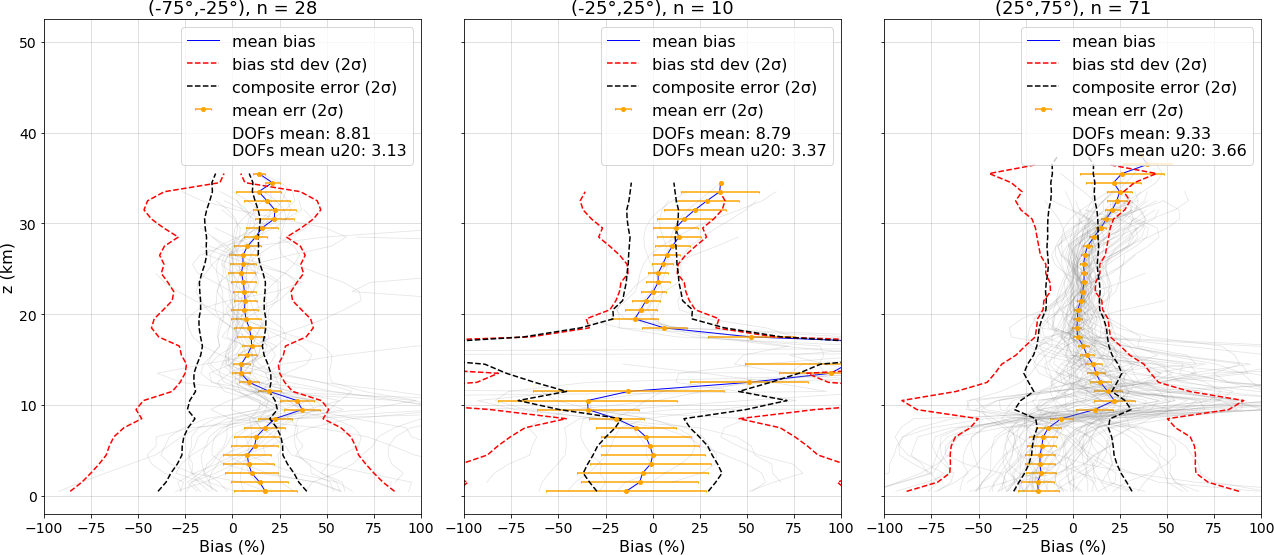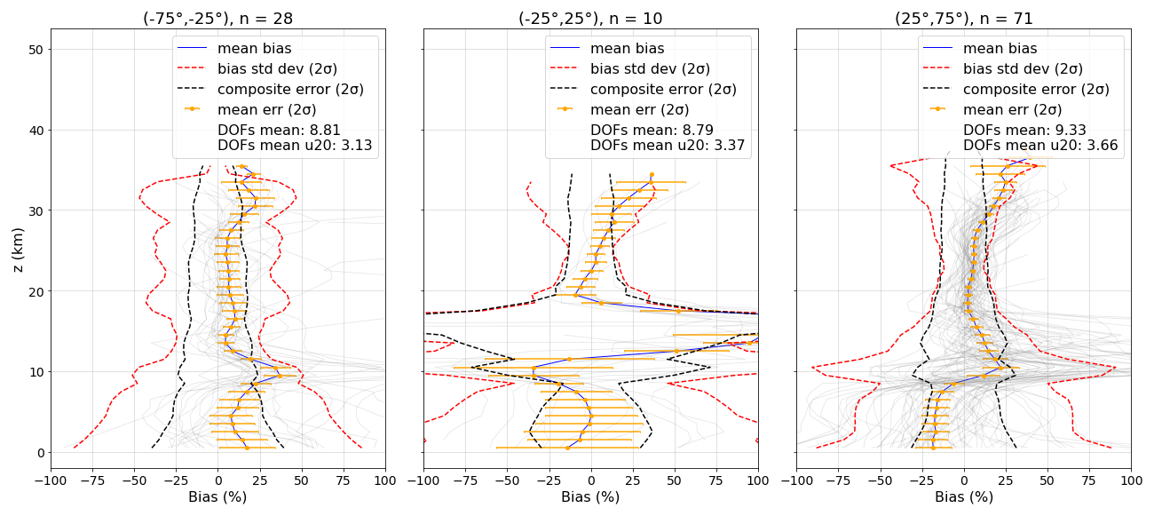 In the latitude band −75 to −25° S, which covers most of the Southern Hemisphere including Antarctica and sub-Antarctic regions, the statistics based on 28 profiles show a positive bias of less than 25 % throughout the vertical range, although it is not significant below 8 km and between 20–30 km. A significant peak of approximately 35 % is observed around 10 km.