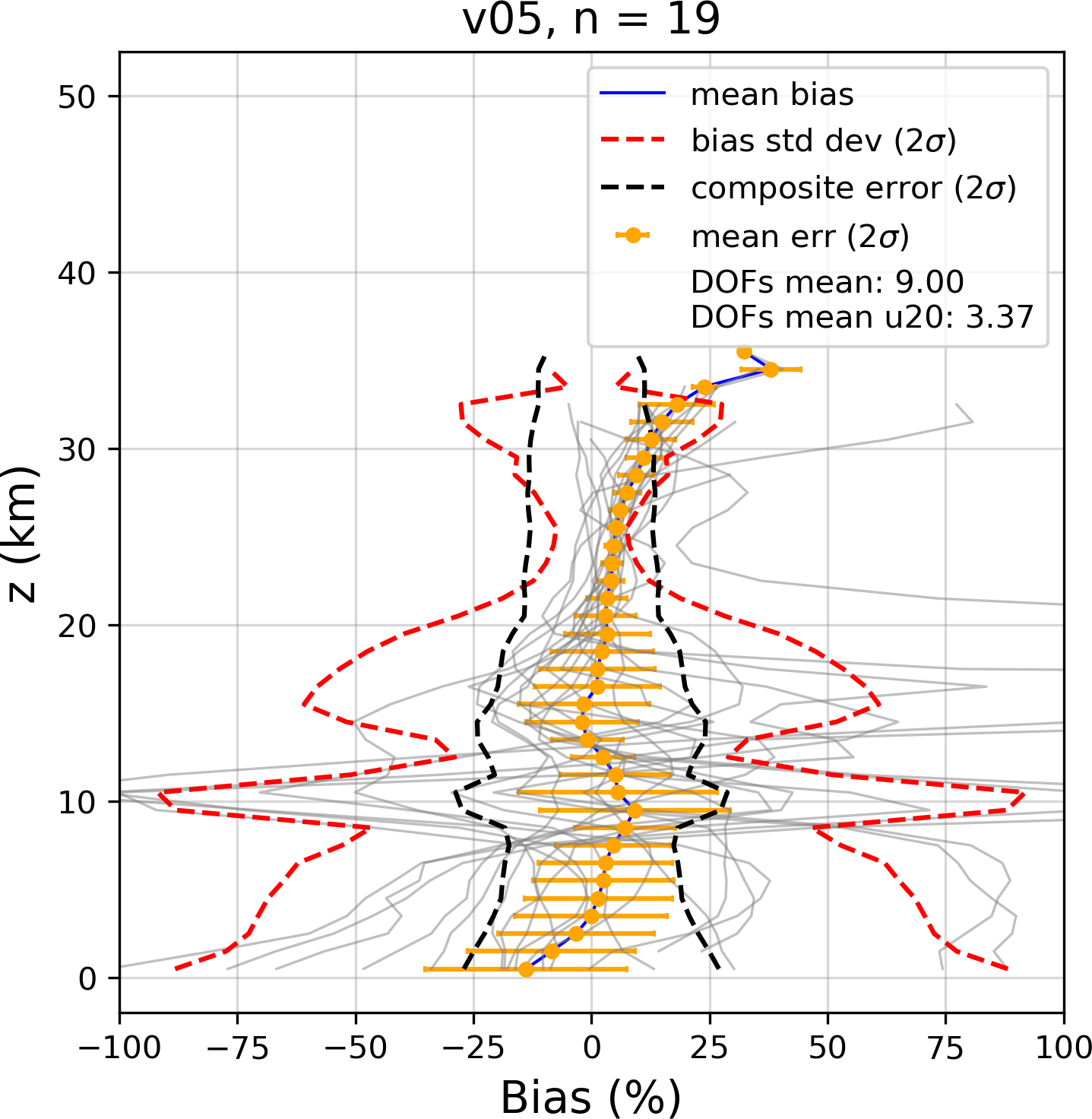 Figure 6Validation of version v05. The blue line shows the mean percentage bias between the fused profiles and the ozonesondes smoothed with the fused product's AK. The red dashed line indicates the standard deviation of the mean bias (2σ), while the black dashed line represents the combined error (2σ). The orange bars show the standard error of the mean. The transparent grey lines correspond to the individual averaged profiles. Here n indicates the total number of valid fused profiles considered.