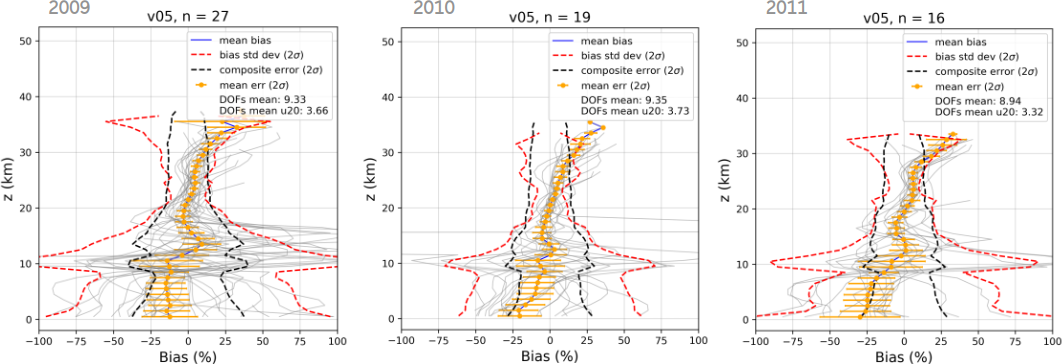 Validation results over 2009–2011 in the 5° S–55° N band show a statistically significant bias at most altitude levels. A positive bias (up to 20 %) is observed above 8 km, peaking around 10 km, while a negative bias (reaching −25 %) is found below 8 km. A similar behavior is seen in the other latitudinal bands, with notable variations: (1) in 75–25° S, the bias is positive at all altitudes, with a peak at 35 % around 10 km; (2) in 25° S–25° N, the bias exhibits strong oscillations but results are not considered reliable due to a low number of coincidences; (3) in 25–75° N, a significant positive bias (25 %) is observed above 8 km, while a significant negative bias (−20 %) is found below.