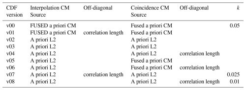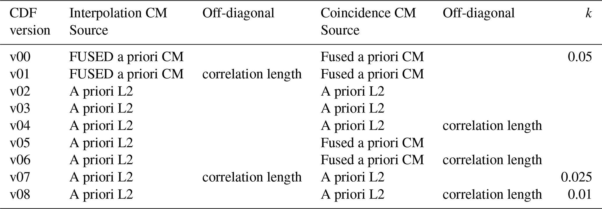 The other two important parameters that can be selected are the interpolation and the coincidence errors. These were used as the basis for tuning the configuration. We tested nine different configurations combining various approaches to error modeling. These versions are summarized in Table 1. For each version, we applied the CDF algorithm for the year 2008. The table reports the sources of the CM used to model coincidence and interpolation errors. When the Fused a priori CM is indicated, the same a priori CM from the fused profiles was used for all inputs to model additional errors. In contrast, “A priori L2” refers to the use of the individual a priori CM specific to each L2 product. In some versions, off-diagonal elements were reconstructed by applying a correlation function with a fixed correlation length of 6 km. This reconstruction was implemented using the following formulation: