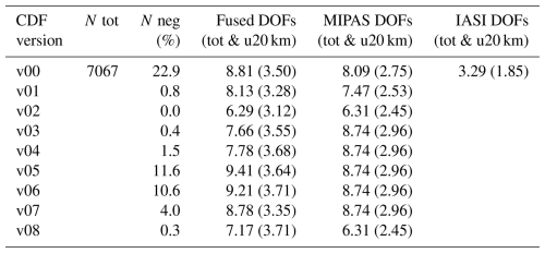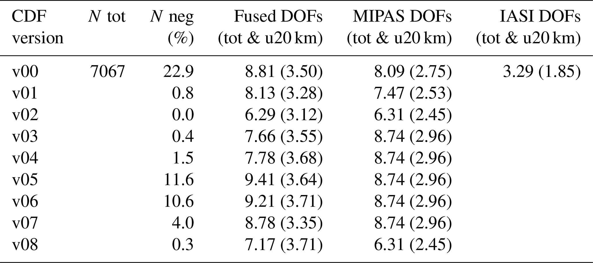 Table 2DOFs and number of profiles containing negative values analysis. Header is composed of: the total number of fused profiles in 6 d (N tot), the percentage of fused profiles with more than one negative value (N neg), and the mean DOFs both over the full profile and below 20 km, for both the fused (Fused DOFs (tot & u20 km)) product and for L2 (MIPAS DOFs (tot & u20 km); IASI DOFs (tot & u20 km) products.