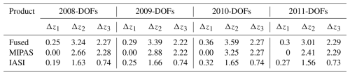 Table 3Mean DOFs for different altitude ranges (Δz1: 0–5 km, Δz2: 5–20 km, Δz3: 20–30 km), and for each product and year.