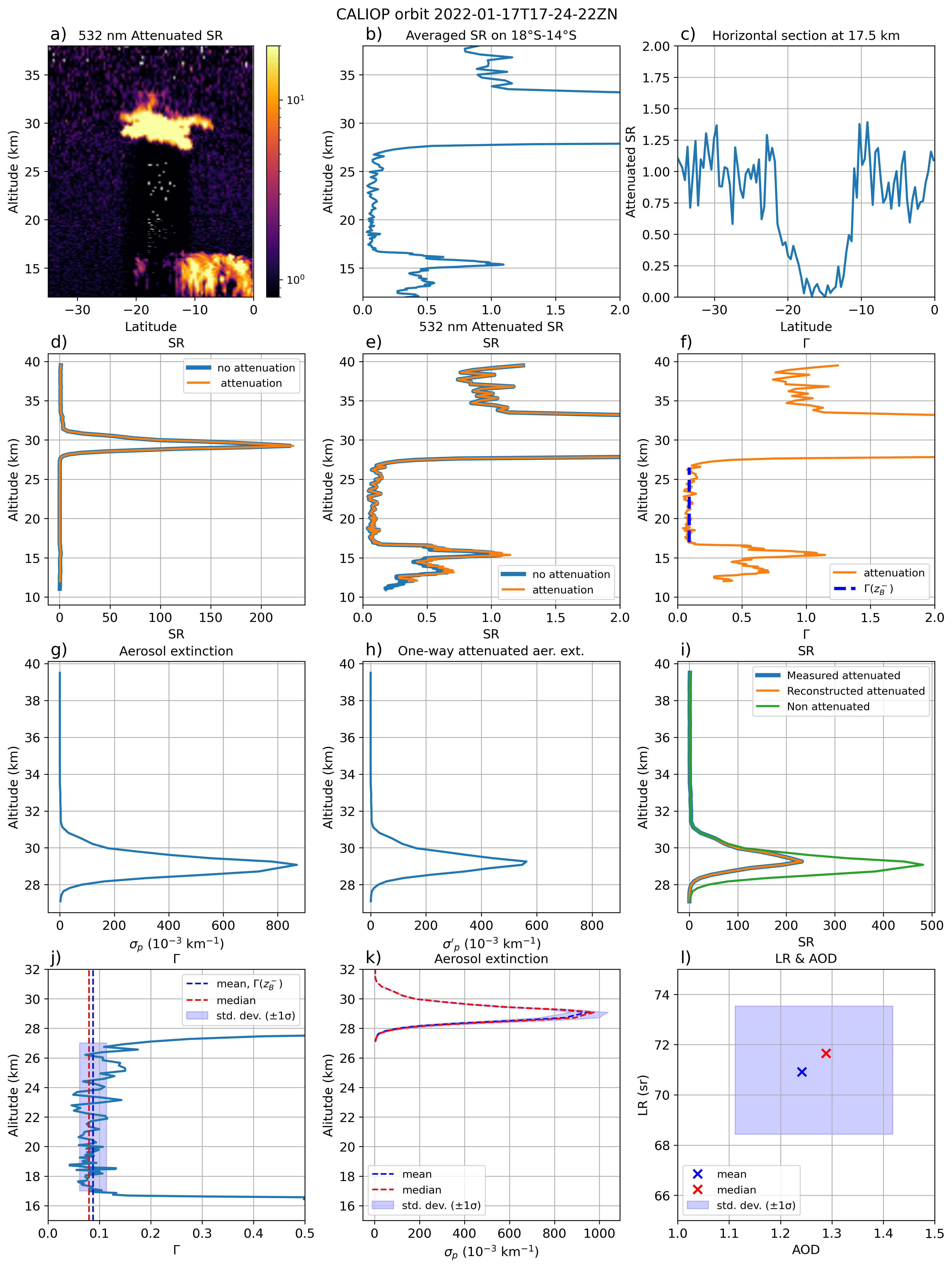 Figure 1(a) CALIOP 532 nm attenuated scattering ratio SR from orbit 2022-01-17T17-24-22-ZN on 17 January 2022. (b) Same as (a) but averaged between 18 and 14° S. (c) Horizontal section of (a) at 17.5 km altitude. (d) Blue curve: same as (b) (SR, no molecular attenuation). Orange curve: (b) taking into account molecular attenuation including O3 transmission (Γ, Eq. 2). (e) Same as (d) with a reduced scale to better see variations in the vicinity of 1. (f) Orange curve: same as (e). Blue dotted line: corresponds to . (g) Aerosol extinction σp retrieved together with Sp. (h) One-way attenuated aerosol extinction which is . (i) Blue curve: measured CALIOP attenuated scattering ratio. Orange curve: reconstructed attenuated scattering ratio from retrieved σp, Sp and d. Green curve: reconstructed non attenuated scattering ratio from retrieved σp and Sp. (j) Mean (, blue dotted line), median (red dotted line) and standard deviation (blue area) of Γ calculated below the aerosol layer. (k) and (l) are respectively the corresponding aerosol extinction σp and LR and AOD from Γ values (j).