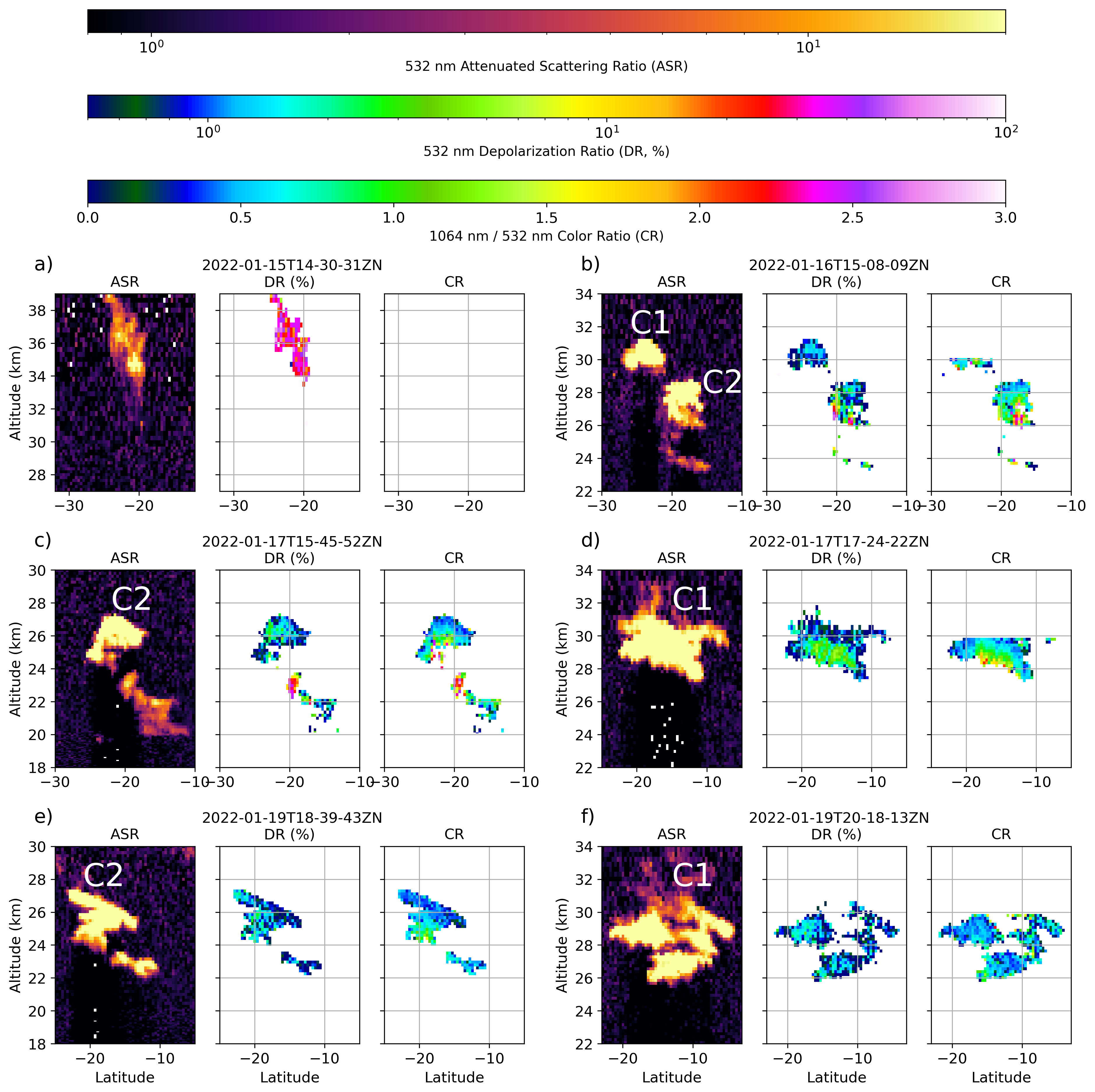 Figure 26 CALIOP night orbits on 15 January (a), 16 (b), 17 (c, d) and 19 (e, f). For each panel, from left to right, are represented the 532 nm ASR, the 532 nm depolarization ratio (DR in %, orthogonal channel/parallel) and the 1064 nm/532 nm color ratio (CR, 1064 nm backscatter coefficient is not available above 30 km). The corresponding CALIOP ground tracks on RGB-Ash maps from Himawari-8 and MSG-1 are provided in Appendix B.