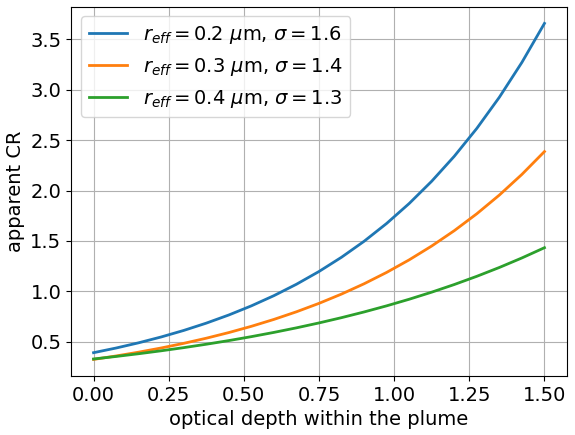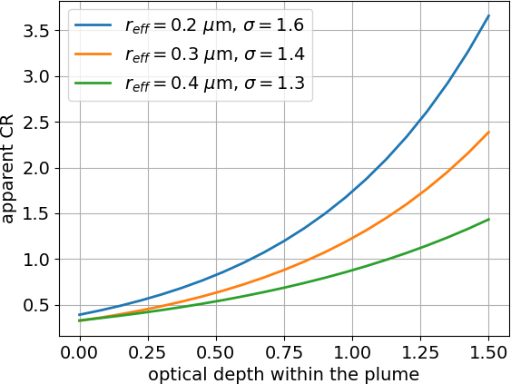 Figure 3 shows that the apparent CR calculated from attenuated backscatter increases with the partial optical depth from the top of the plume and so may vary significantly across the plume when the AOD (that is the total optical depth) is large, even with uniform optical properties. For instance, this can be seen for cloud C1 on 17 January, with theoretical CR values of about 0.4 for small optical depths (top of the cloud), increasing with optical depth (toward the bottom of the cloud) and reaching values of 1.2 and 1.75 (green and orange PSDs, respectively) at an optical depth of 1.24 (CALIOP AOD value for this case) in agreement with the observed CR values provided by CALIOP (Fig. 2d).