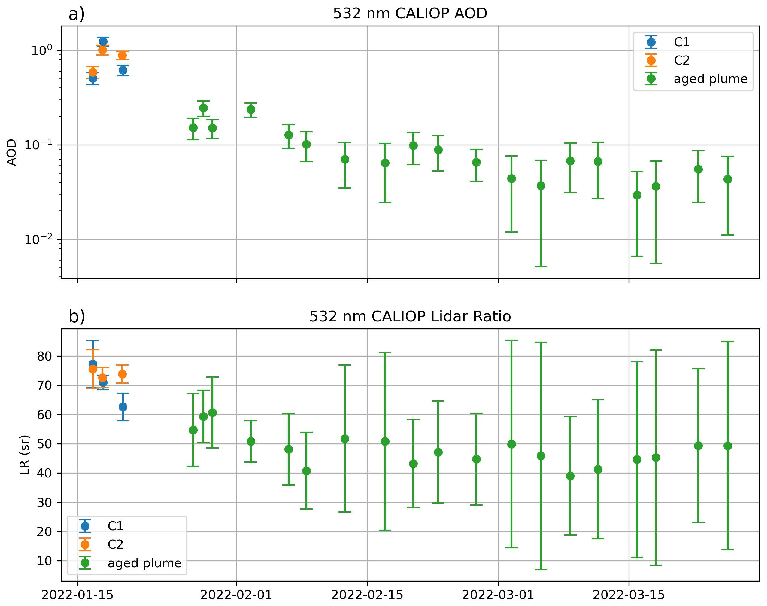 Figure 4(a) Evolution of the AOD retrieved from CALIOP 532 nm attenuated backscatter between 16 January and 25 March 2022. Blue and orange circles correspond respectively to C1 and C2 early clouds. When we can no longer easily distinguish these two plumes, from 27 January onwards, we use the green circles to represent the case of the most significant orbit of the day over all the night orbits of the day outside the SAA zone (see Sect. 2.1). (b) Same as (a) for LR. The error bars come from standard deviation to the mean calculations (see Fig. 1j).