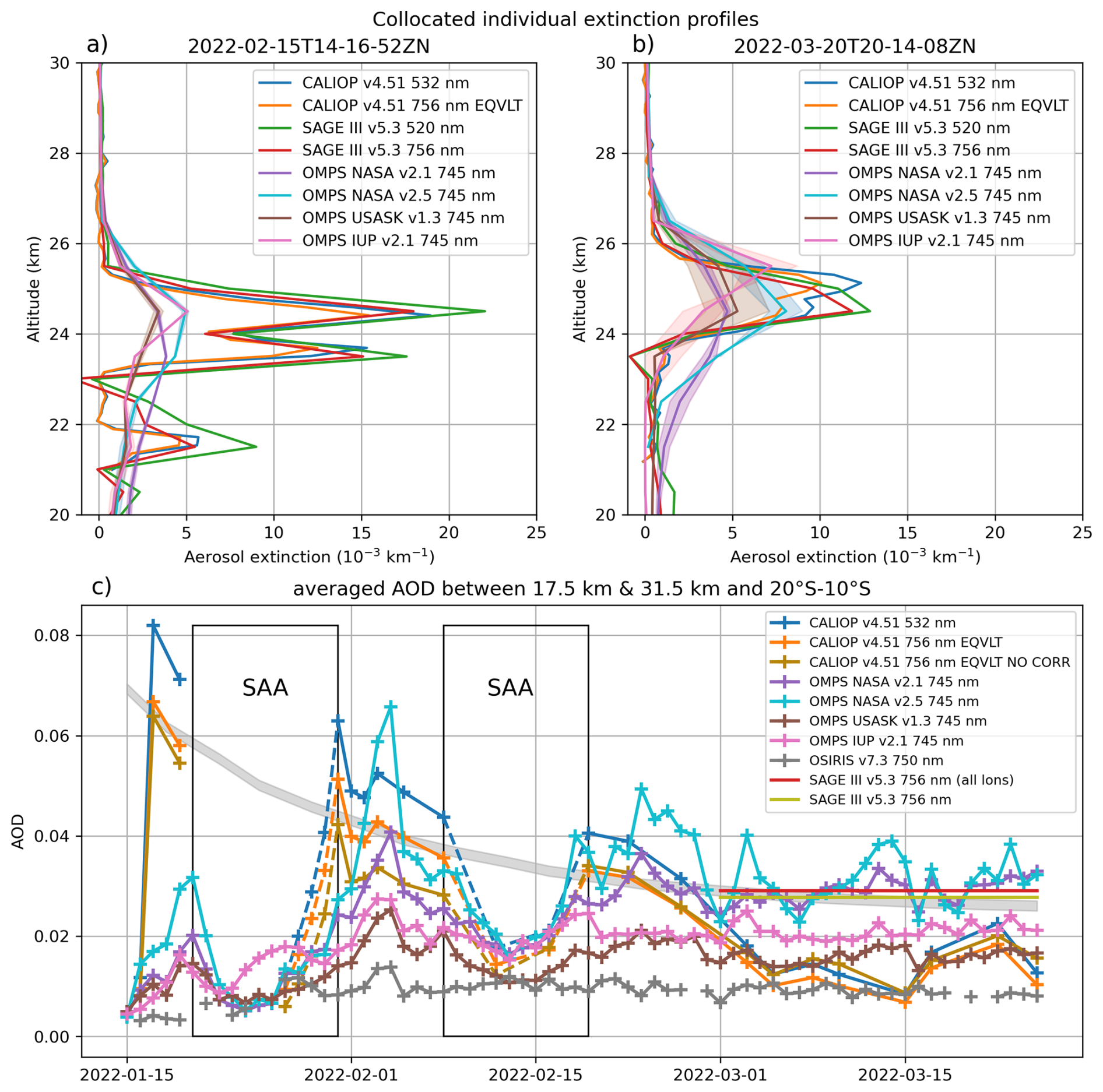 Figure 5(a) Collocated profiles from CALIOP, SAGE III and OMPS-LP on 15 February. CALIOP profile is averaged between 4 and 2° S at 178.5° E and 14:43 UTC. SAGE III profile is measured at 3.2° S, 178.4° E and 18:17 UTC. OMPS-LP profile is averaged between 4 and 2° S at 171.7° W and 00:54 UTC. (b) Collocated profiles from CALIOP, SAGE III and OMPS-LP on 20 March. CALIOP profile is averaged between 21.3 and 19.3° S at 87.2° E and 20:40 UTC. SAGE III profile is measured at 20.3° S, 88.1° E and 00:15 UTC (21 March). OMPS-LP profile is averaged between 21.3 and 19.3° S at 95.5° E and 07:16 UTC. CALIOP night orbits and OMPS-LP day orbits will always have a time lag of about half a day. To compensate for this, we choose a different spatial band between CALIOP and OMPS-LP, taking into account the ERA5 angular velocity using panels (d) and (f) from Fig. 1 in Legras et al. (2022). Shading corresponds to the two OMPS-LP profiles that are averaged over the 2° latitude band. (c) Comparison of daily averaged AOD retrieval excluding profiles in the SAA longitudes from CALIOP (see Sect. 2.1) with several products from passive sensors measuring extinction (SAGE III, OMPS-LP and OSIRIS). Calculations are made between 17.5 and 31.5 km altitude and averaged between 20 and 10° S. The ochre curve represents CALIOP AOD without correction (see Sect. 2.2). The OMPS-LP products contain a large amount of data per day, whereas SAGE III and OSIRIS provide much less data due to their measurement geometry. This is why OSIRIS is missing a few days, and the SAGE III values (red, accounting all longitudes, and green, excluding SAA longitudes) for March are monthly averages. The black boxes represent time periods when the main part of the plume is in the SAA zone. For all the three plots, CALIOP 756 nm is converted from CALIOP 532 nm using Mie calculations (see Sect. 2.6). Data from OMPS-LP NASA are shown after applying filtering (see Appendix E).