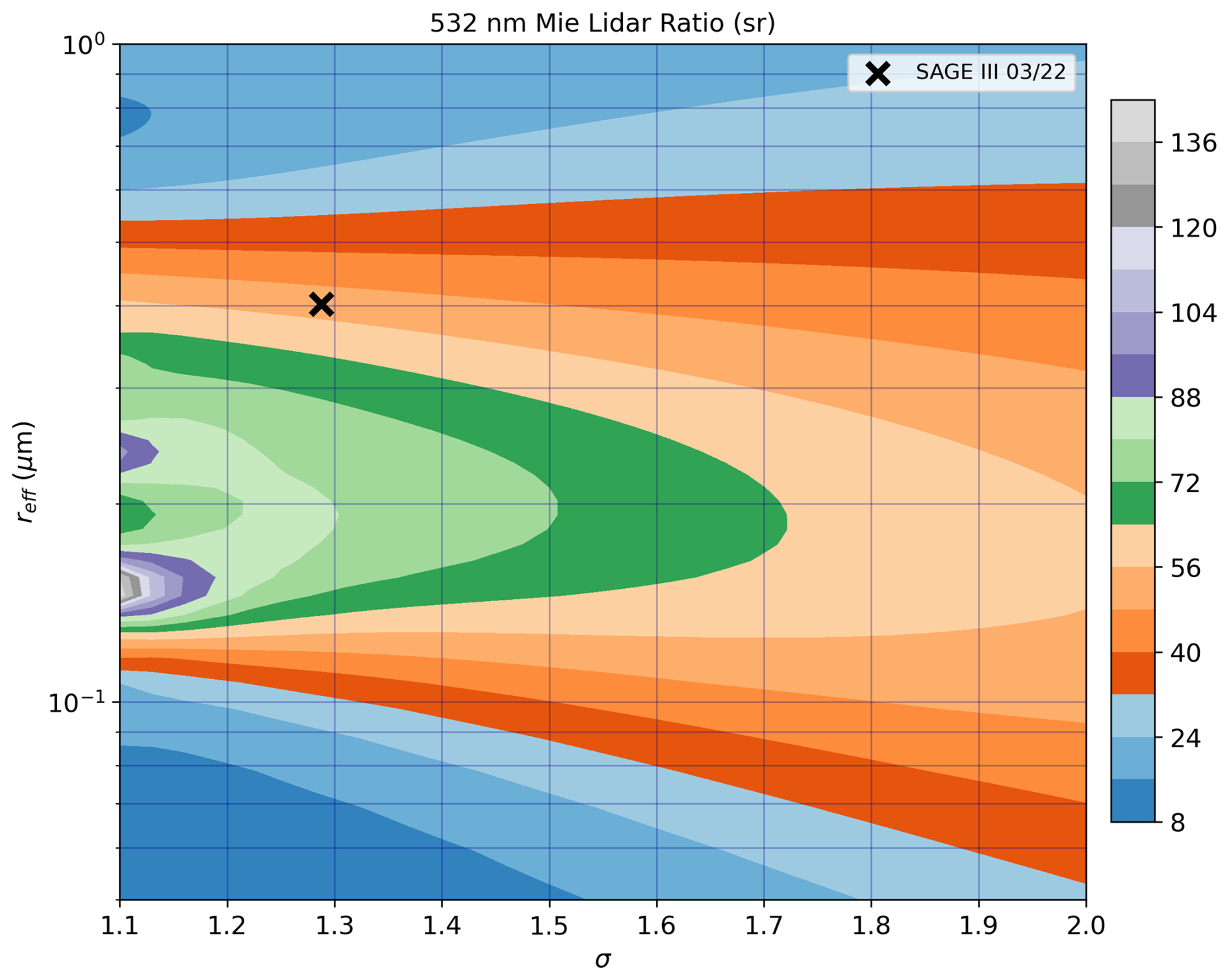 Figure 6Theoretical LR calculated using a Mie code (see Sect. 2.6) as a function of the effective radius reff and the mode width σ of a lognormal distribution. The black cross represents the mean values from SAGE III of reff and σ – respectively 0.40 µm and 1.29 – inside the plume in March 2022 between 30 and 10° S taken from Fig. 2 in Duchamp et al. (2023).
